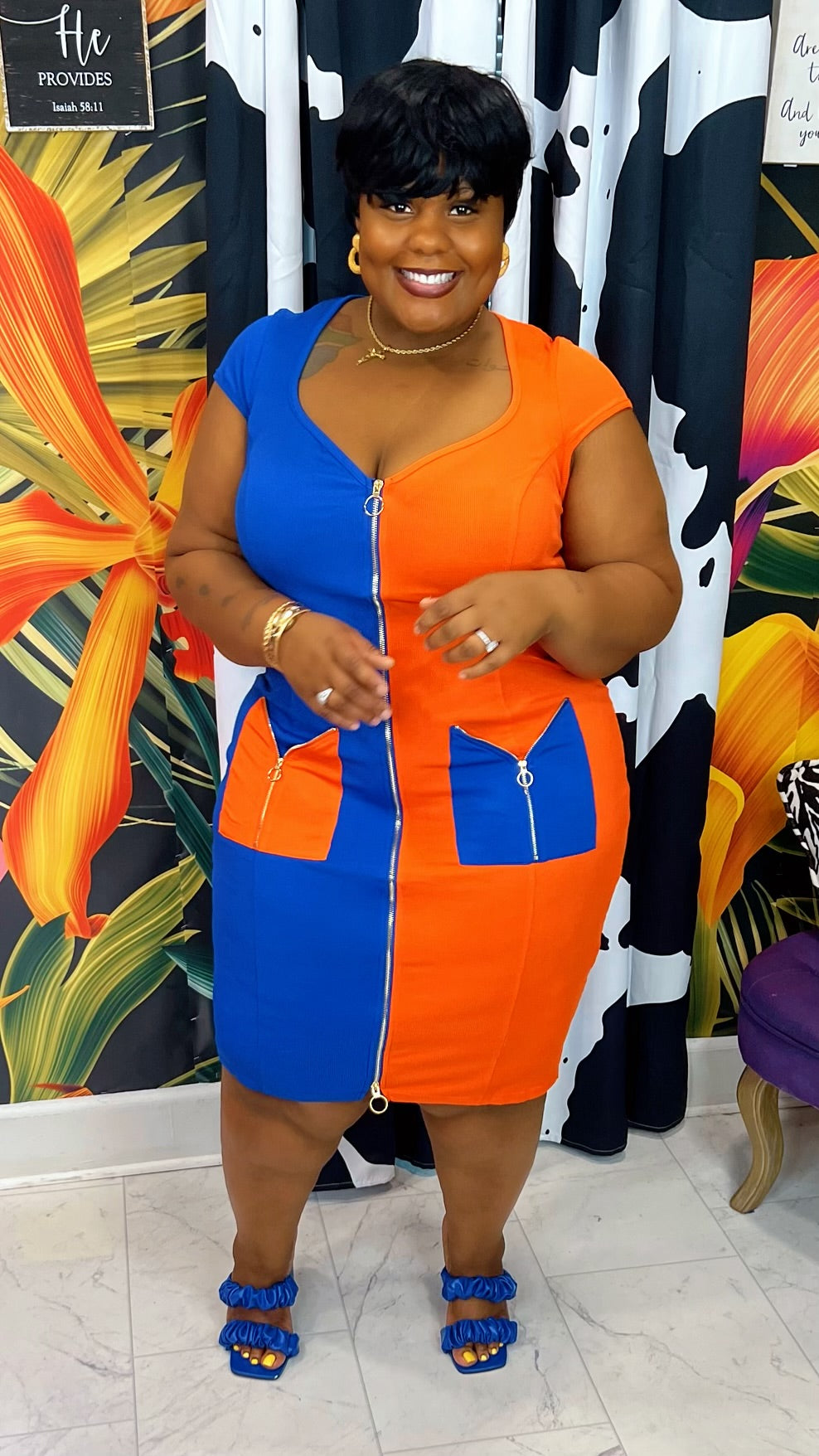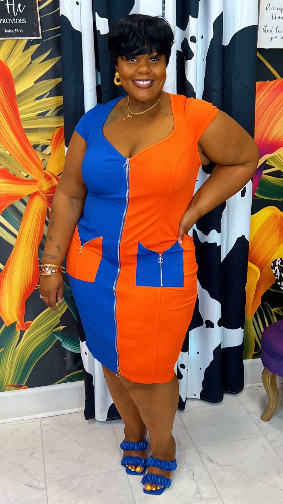 This Sugar & Spice- Royal Blue & Orange dress is a perfect blend of chic and professional! The body con material crafted in a colorblock design gives you a flattering and modern look. Create a stunning look for any occasion!