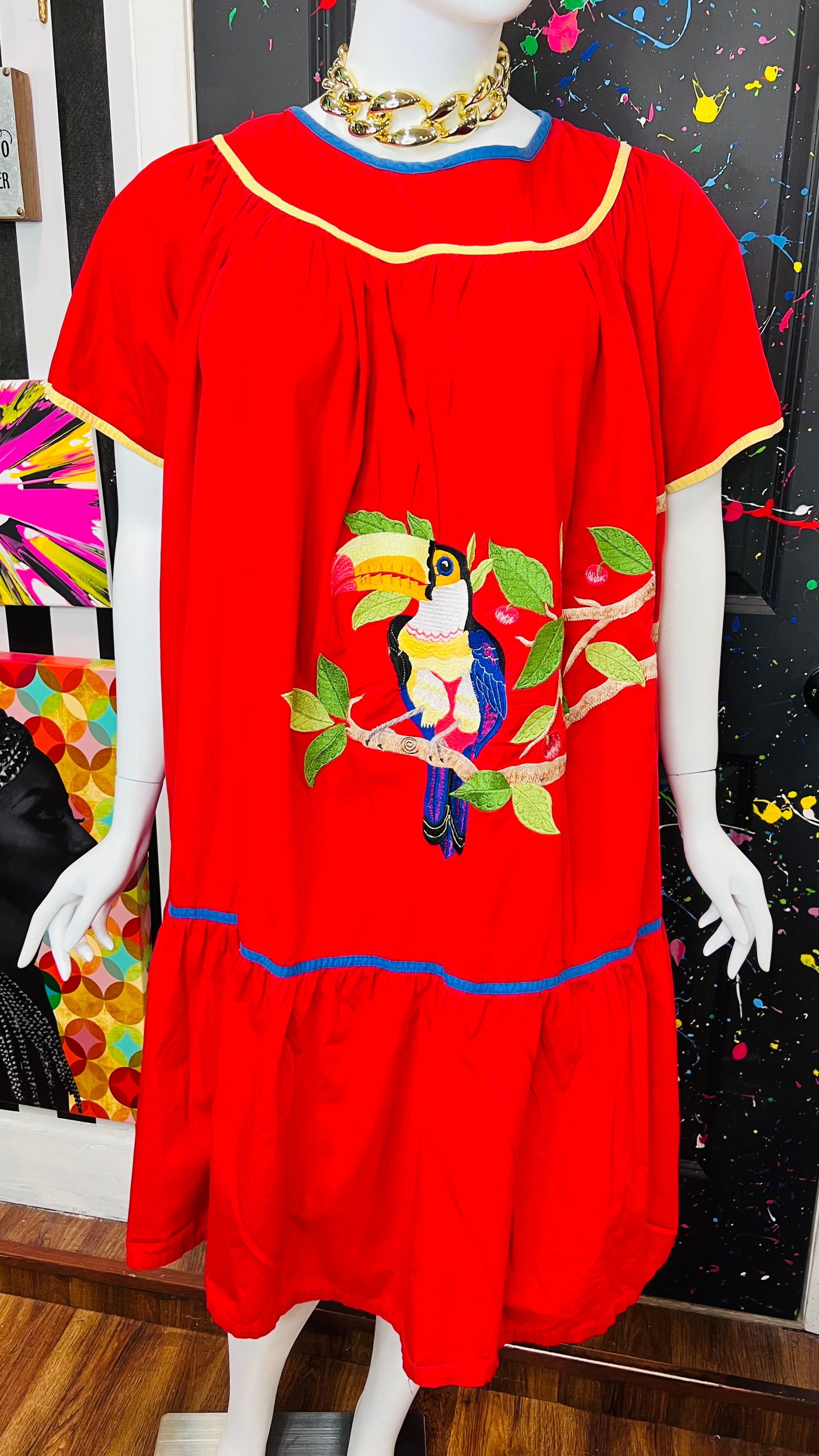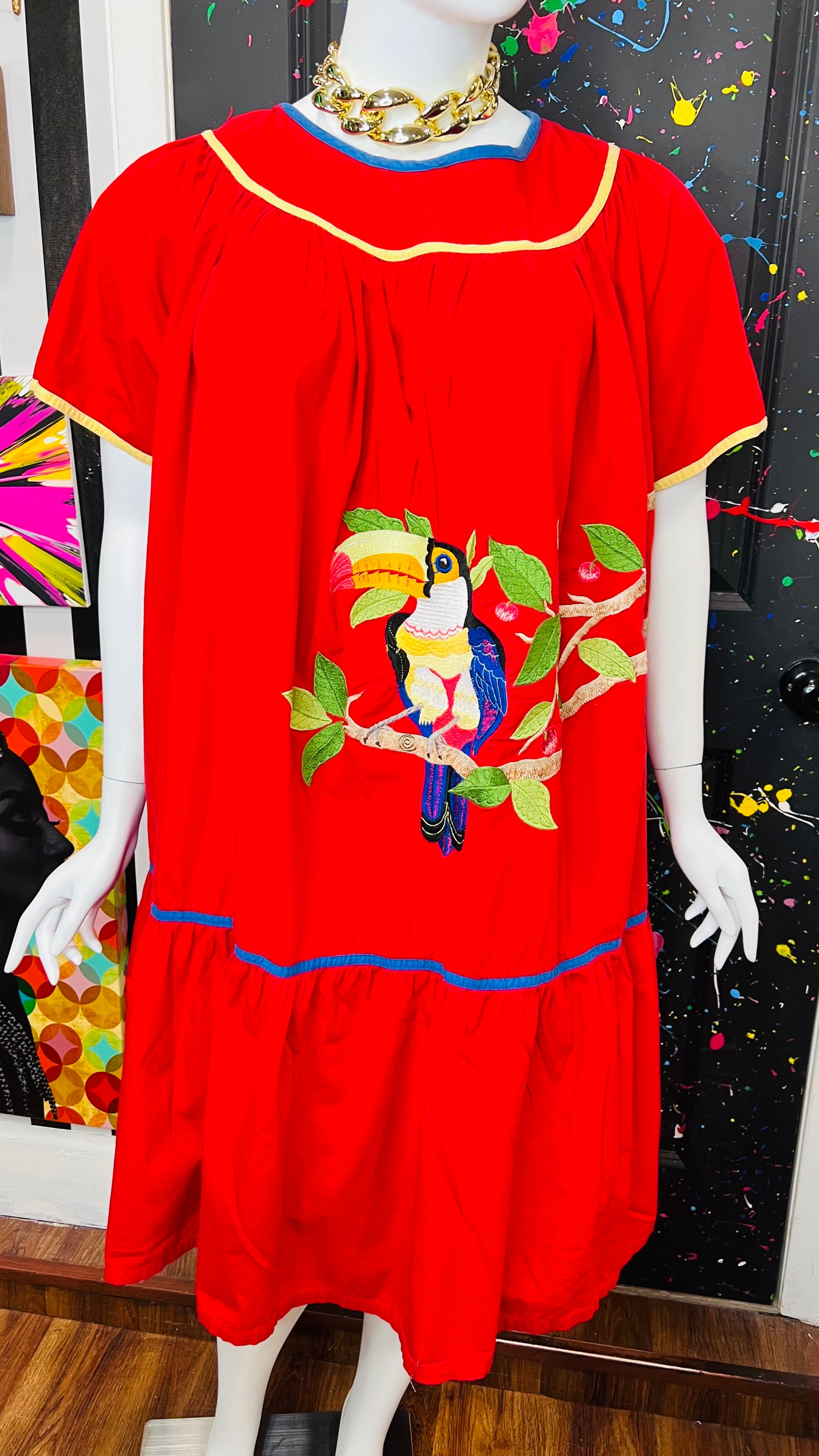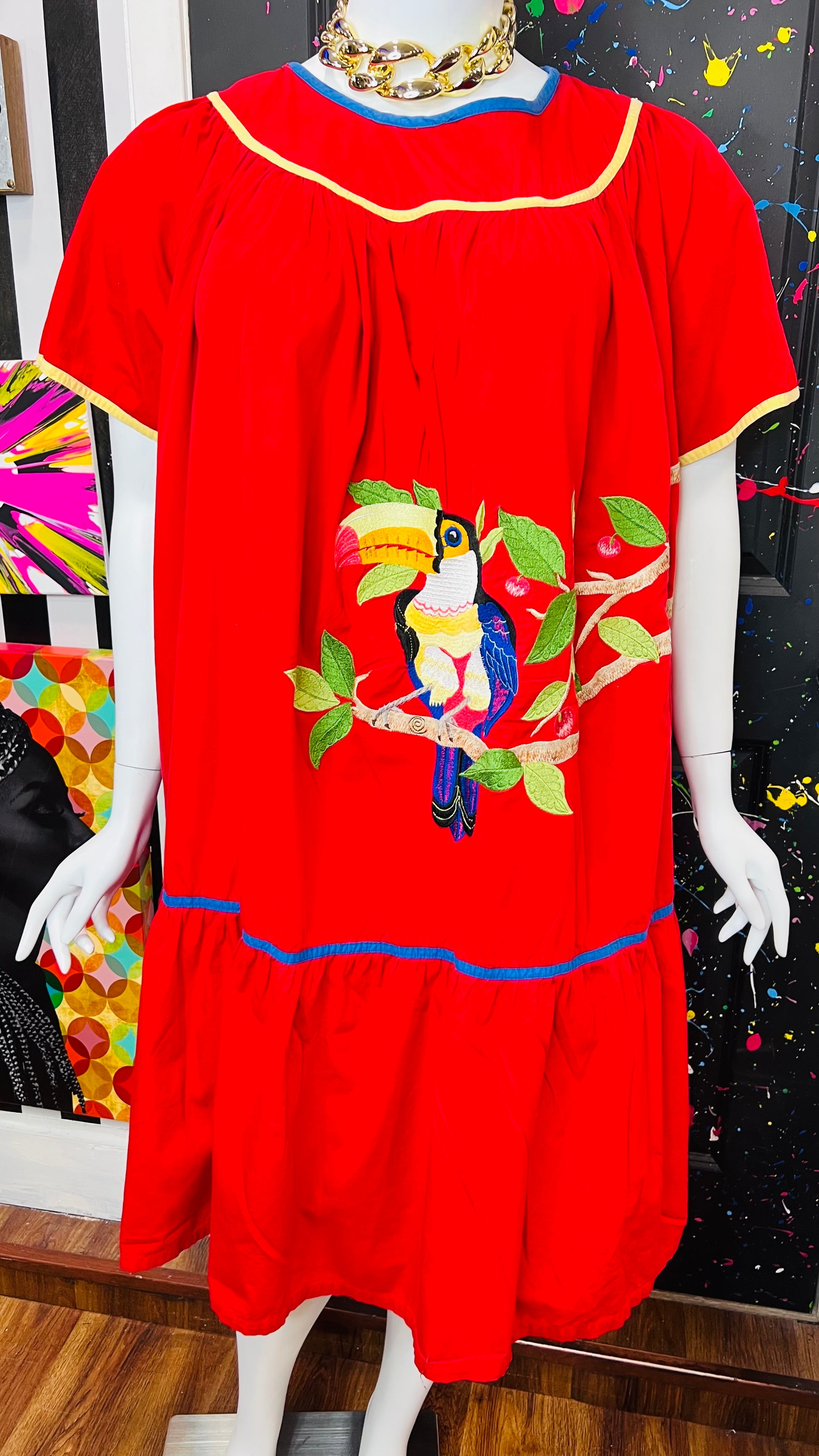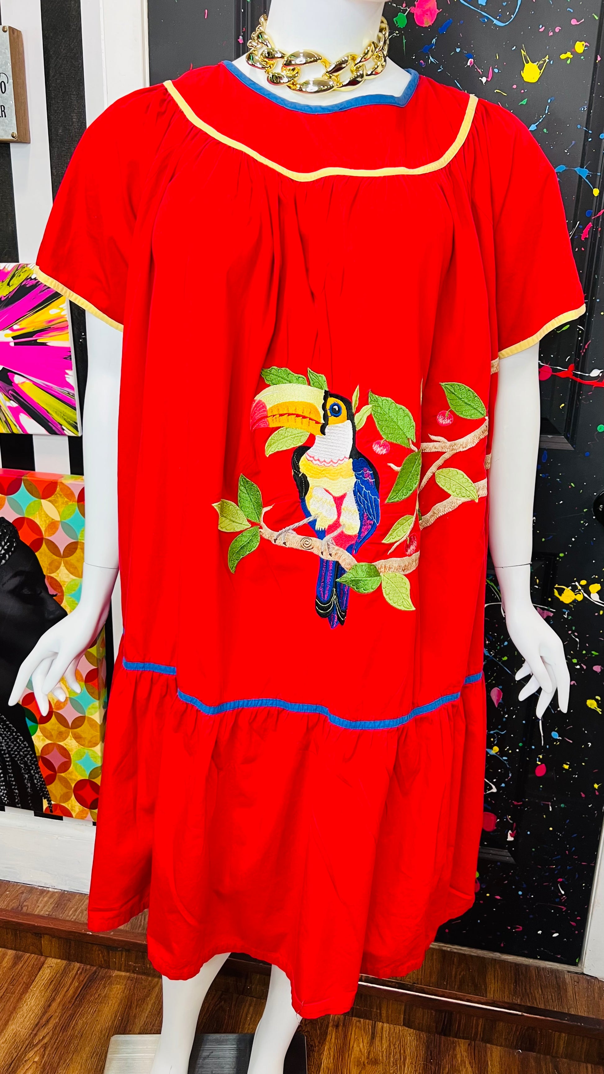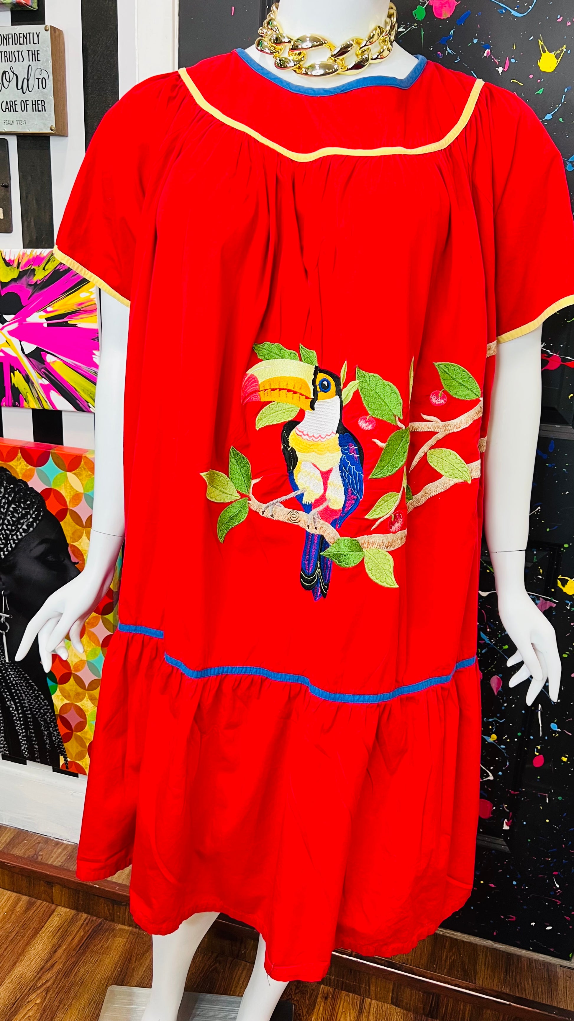 Vintage Cotton Red Parrot House Dress w/Pockets (22/24)