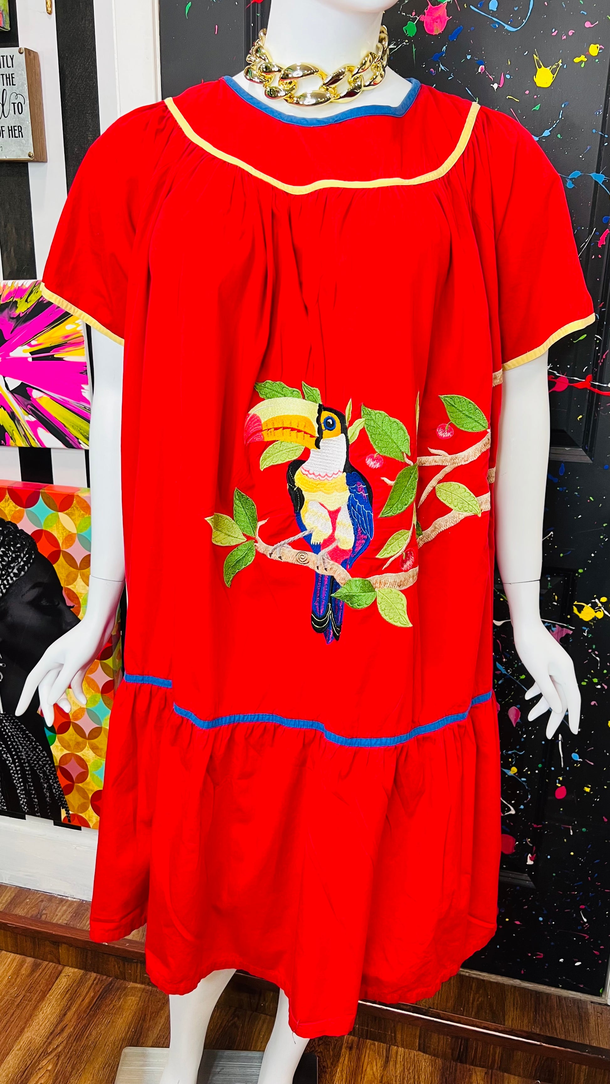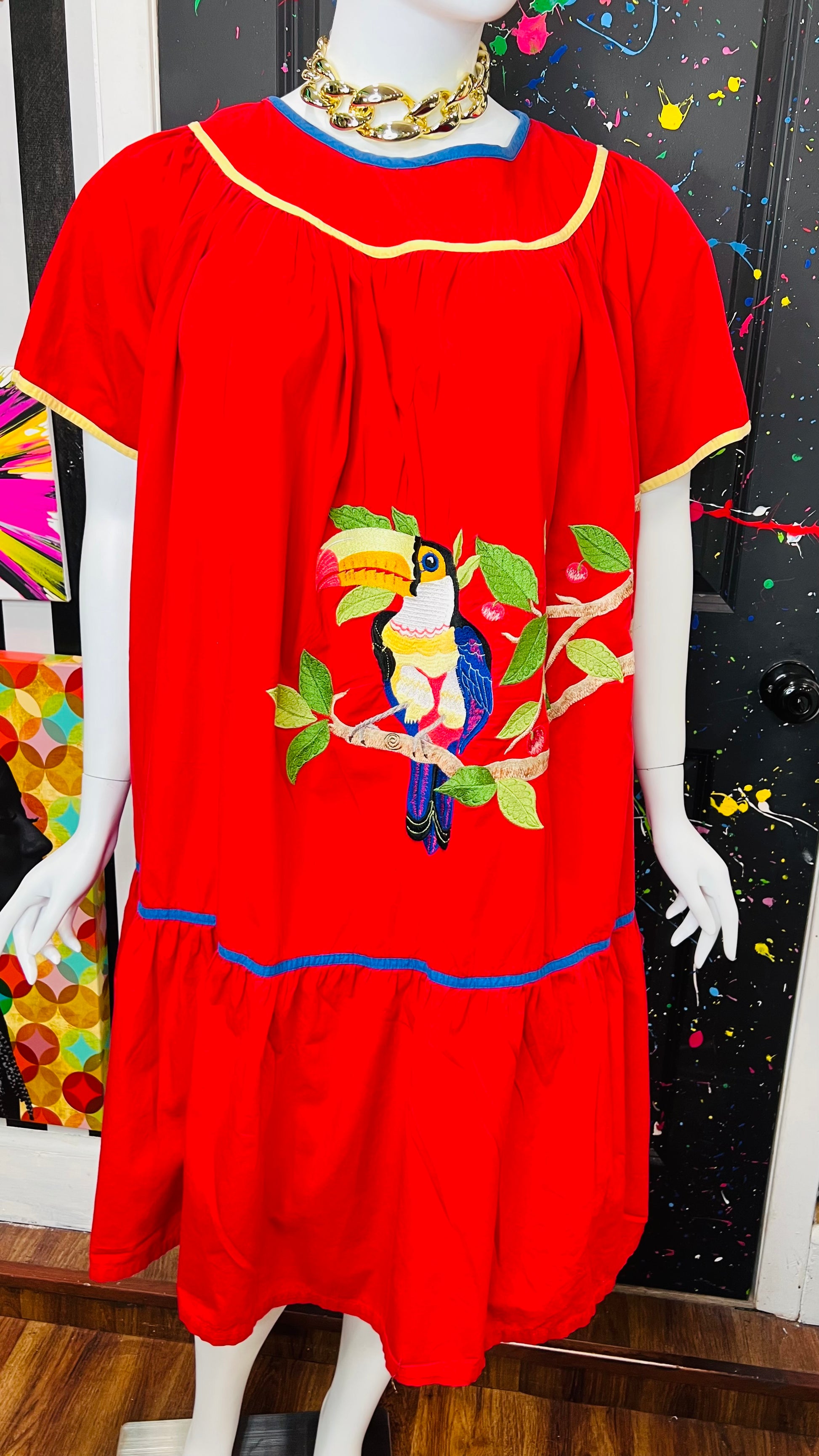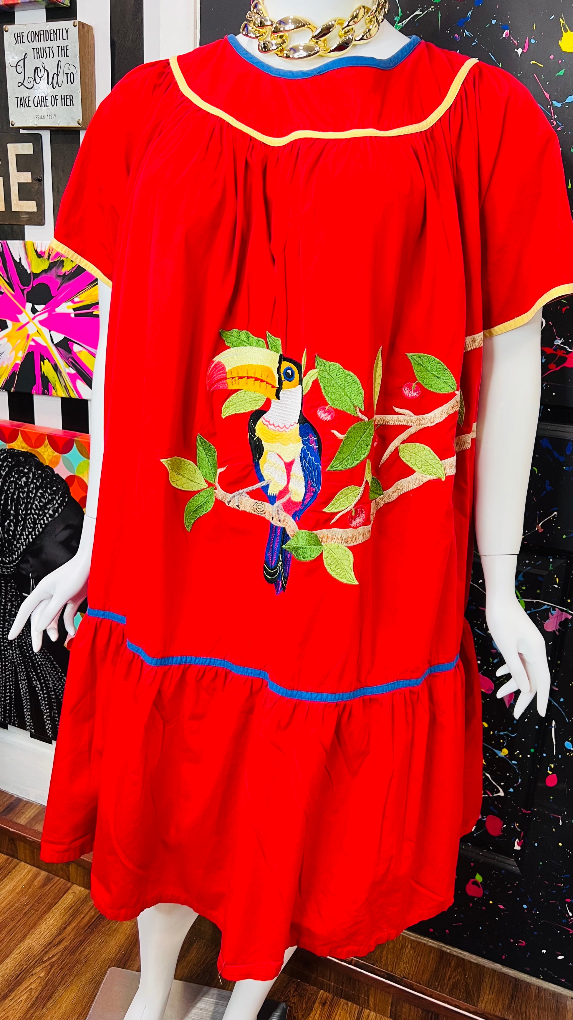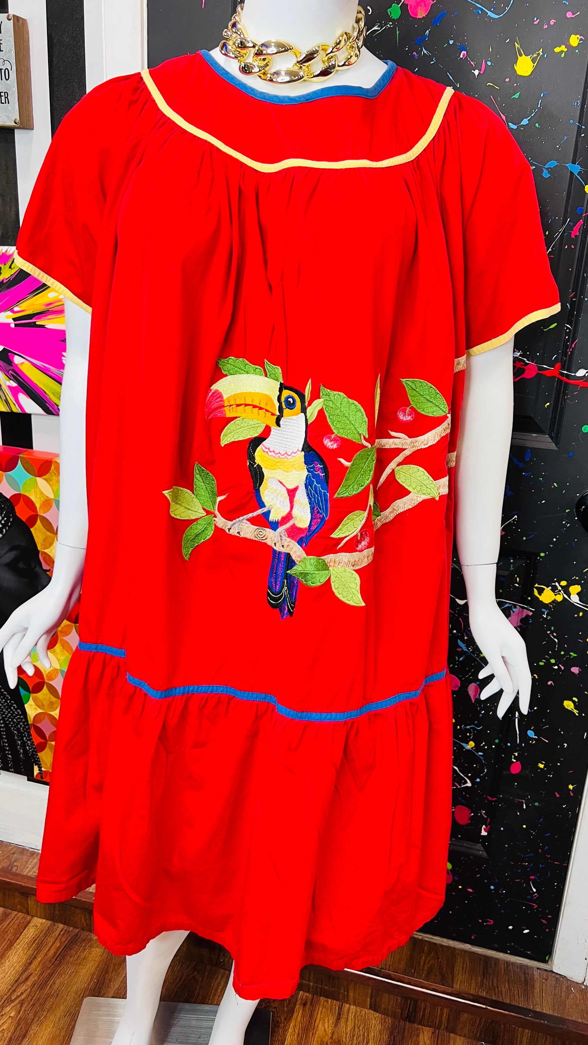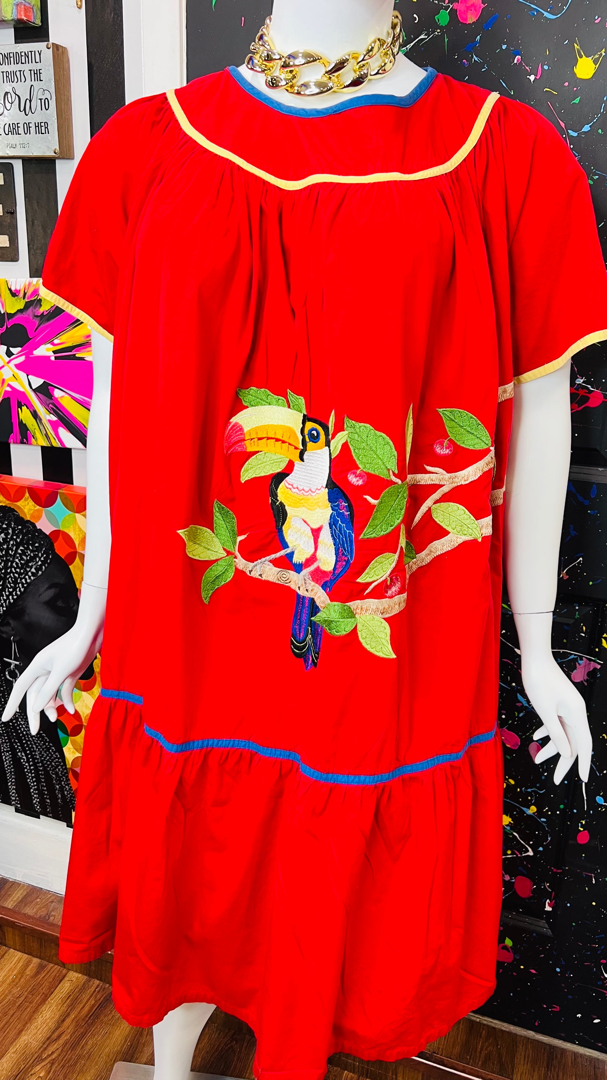 Vintage Cotton Red Parrot House Dress w/Pockets (22/24)