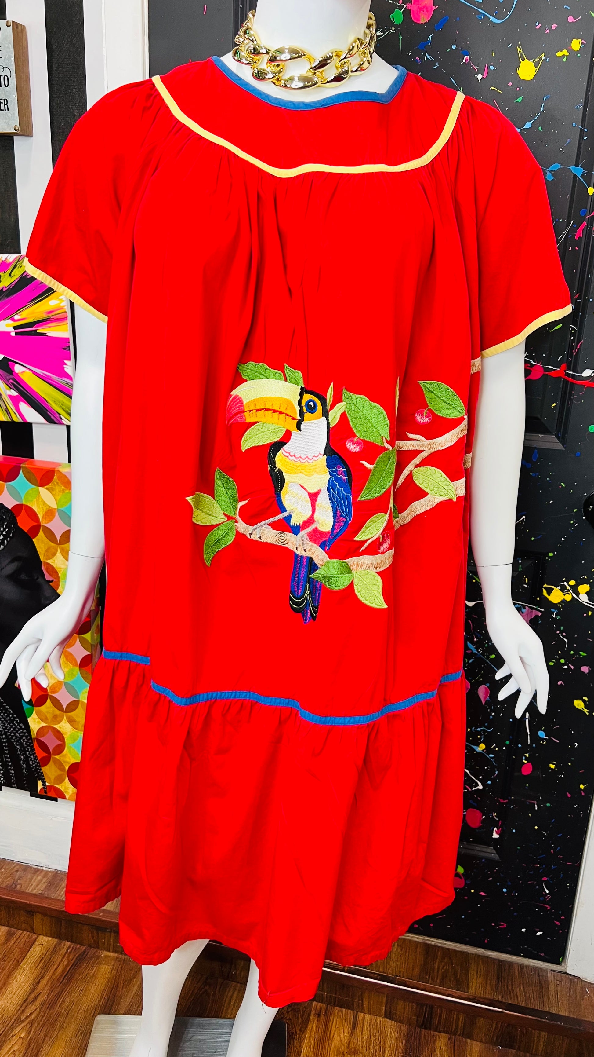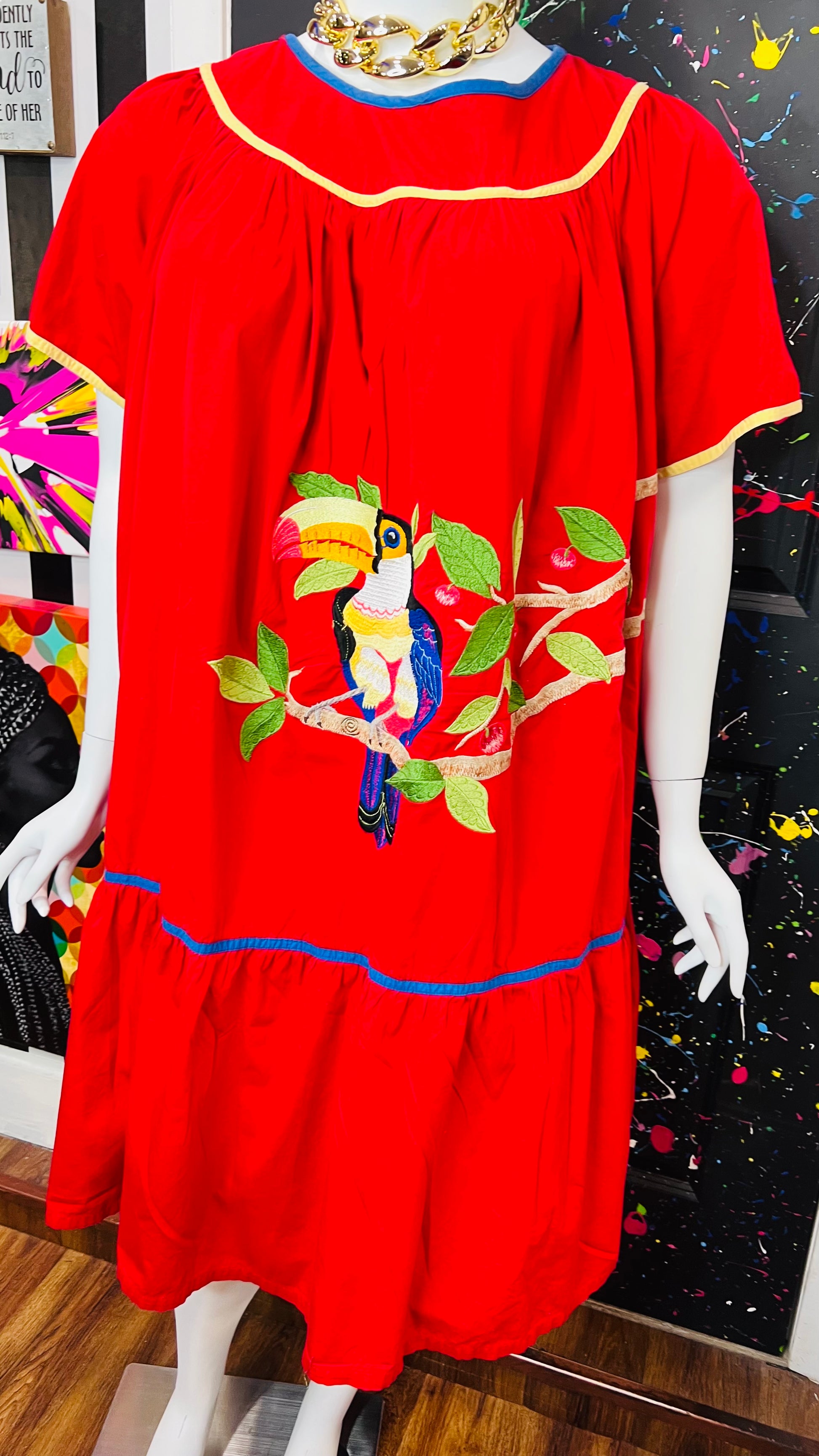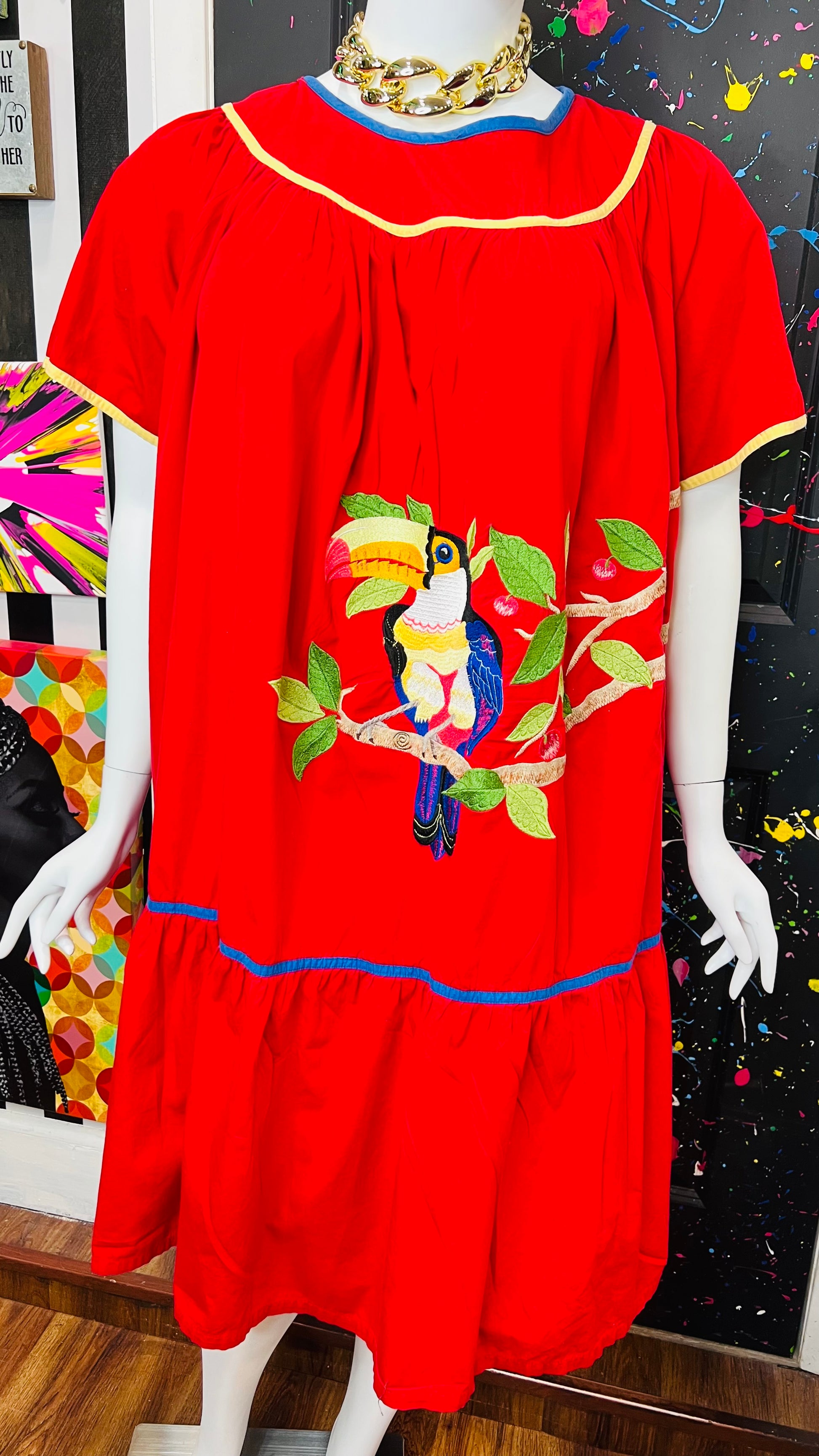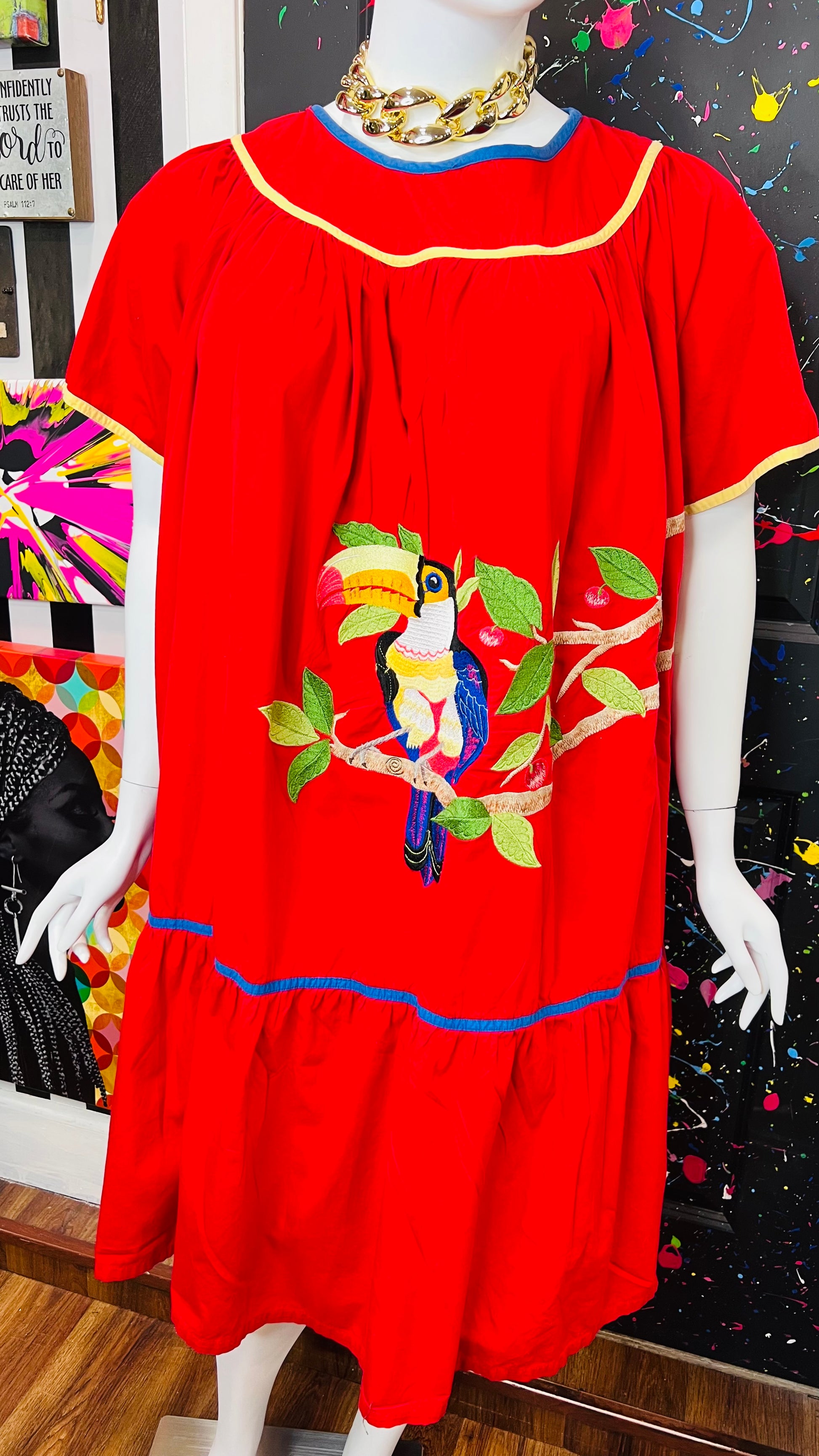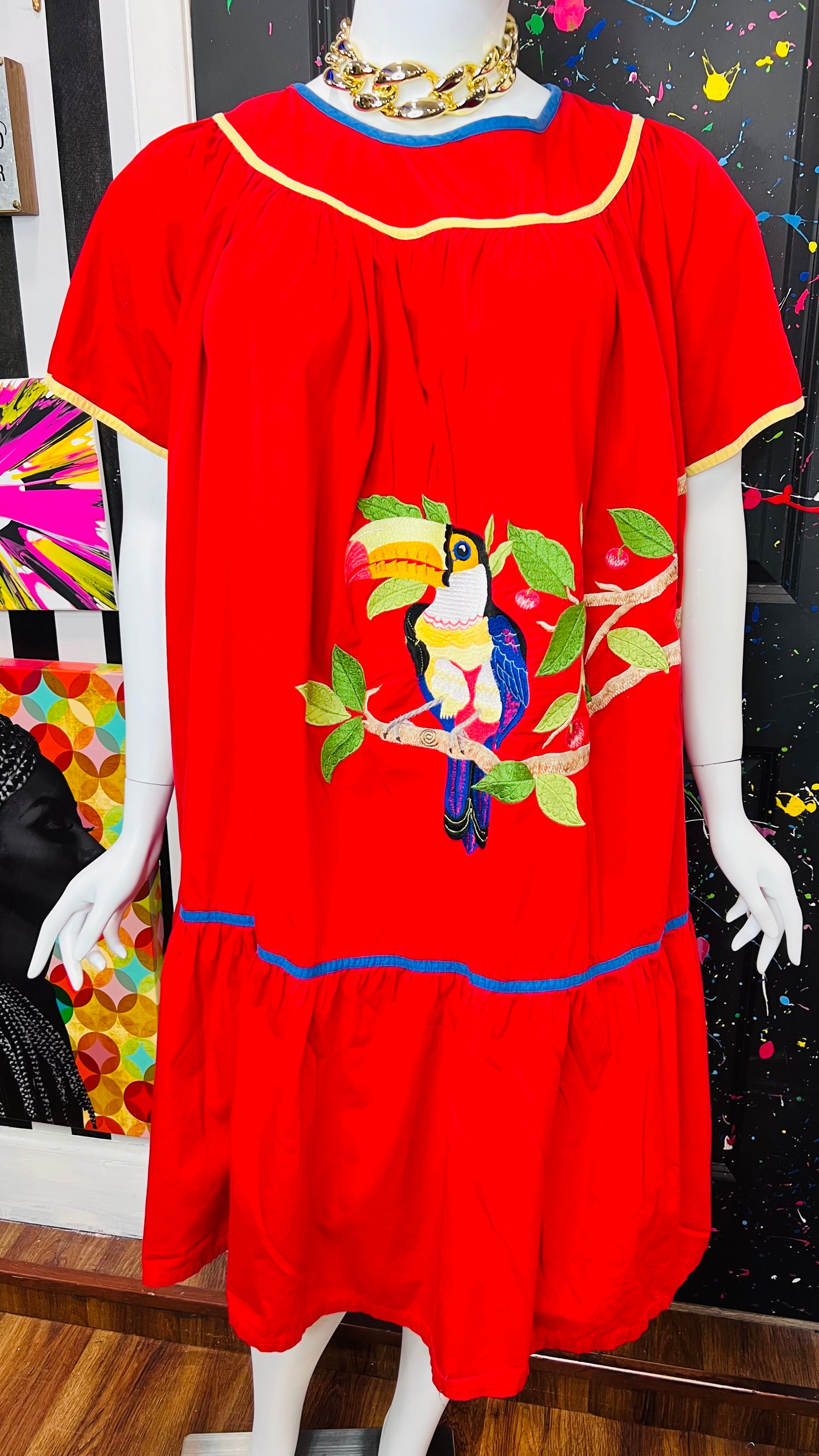 Vintage Cotton Red Parrot House Dress w/Pockets (22/24)