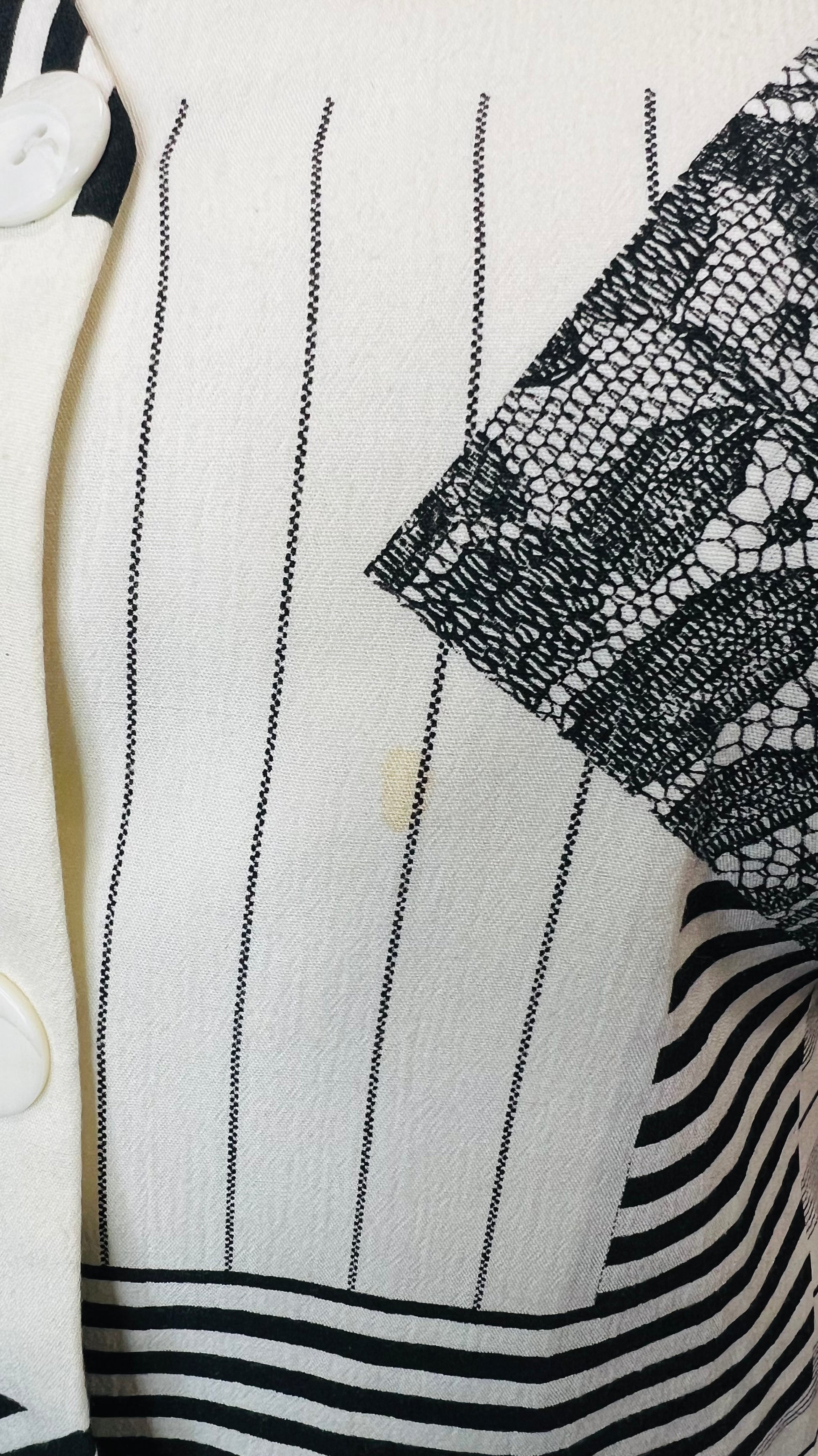 Imperfection (see photos): small spot on front of blouse. This can likely be treated & laundered out.