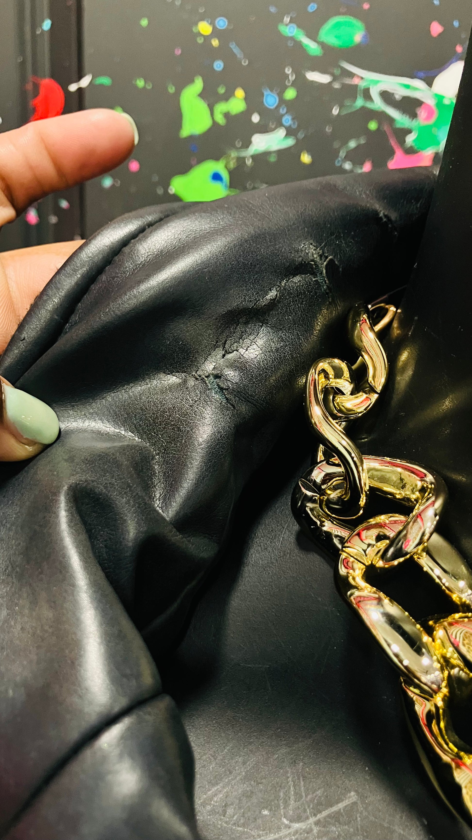 Imperfection (see photos): Some cracking around the neck line. This is not noticeable while wearing.