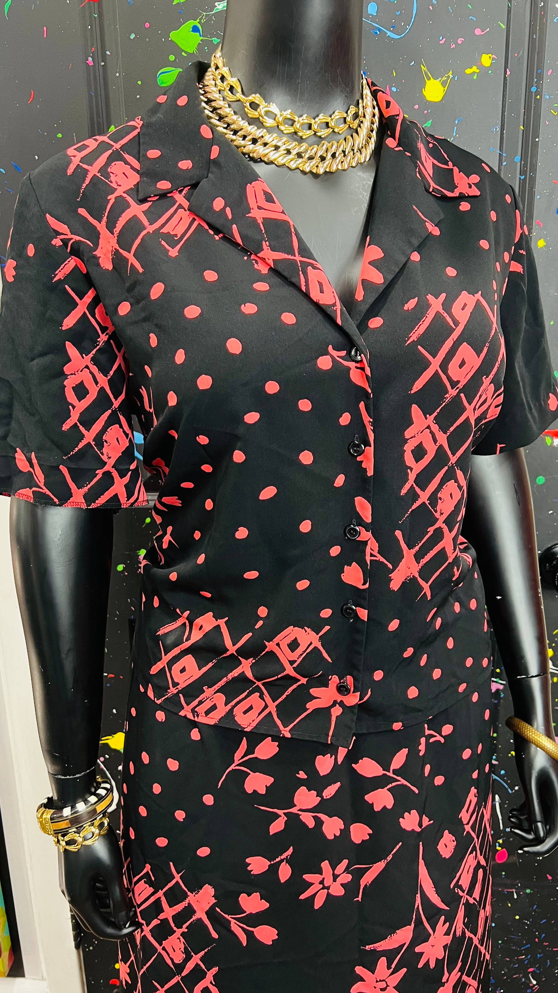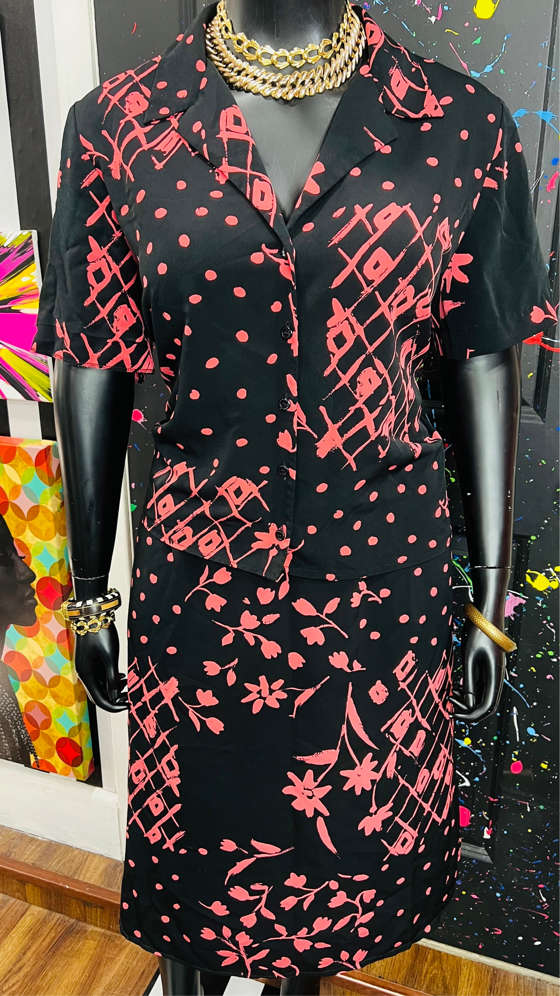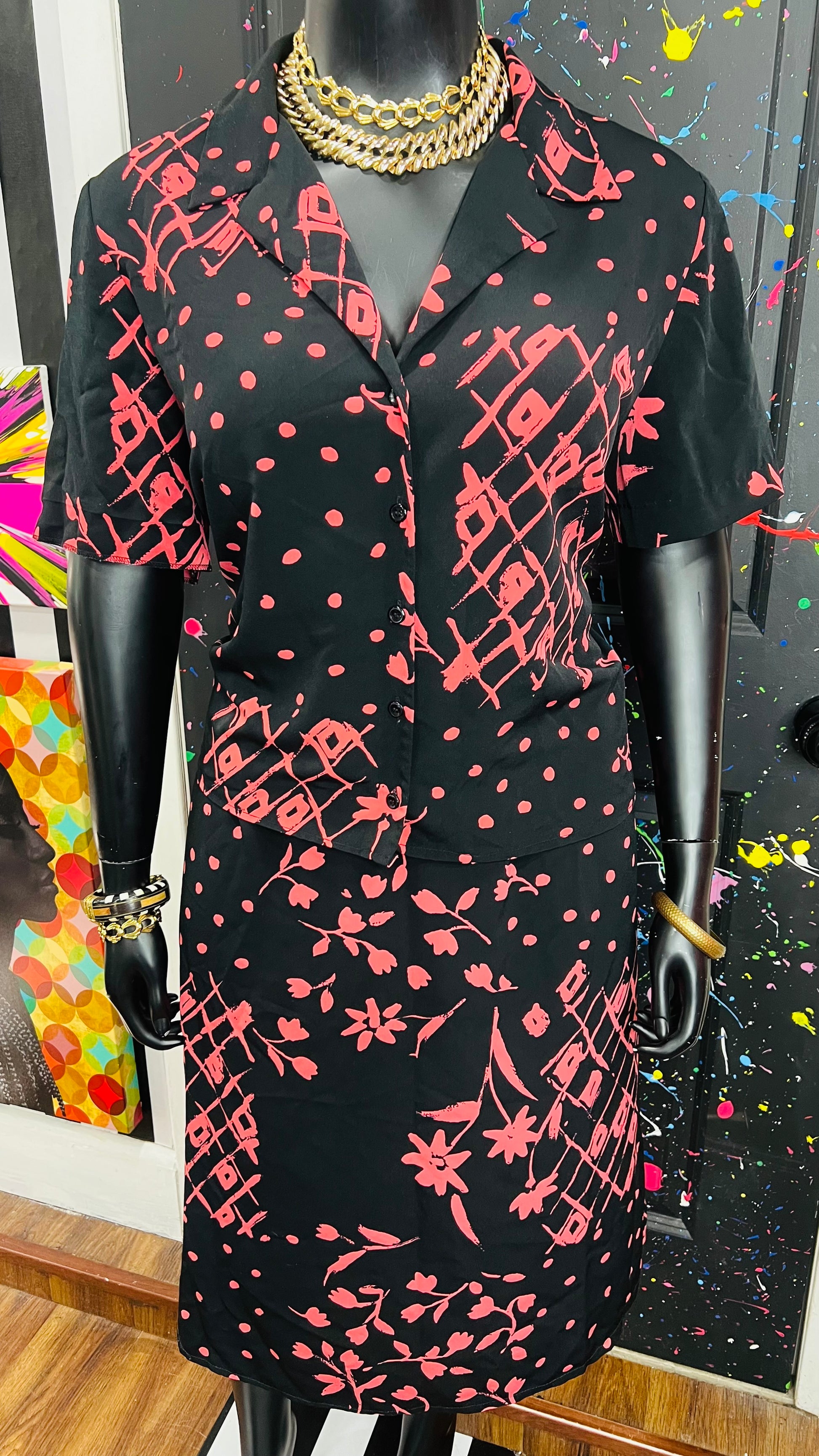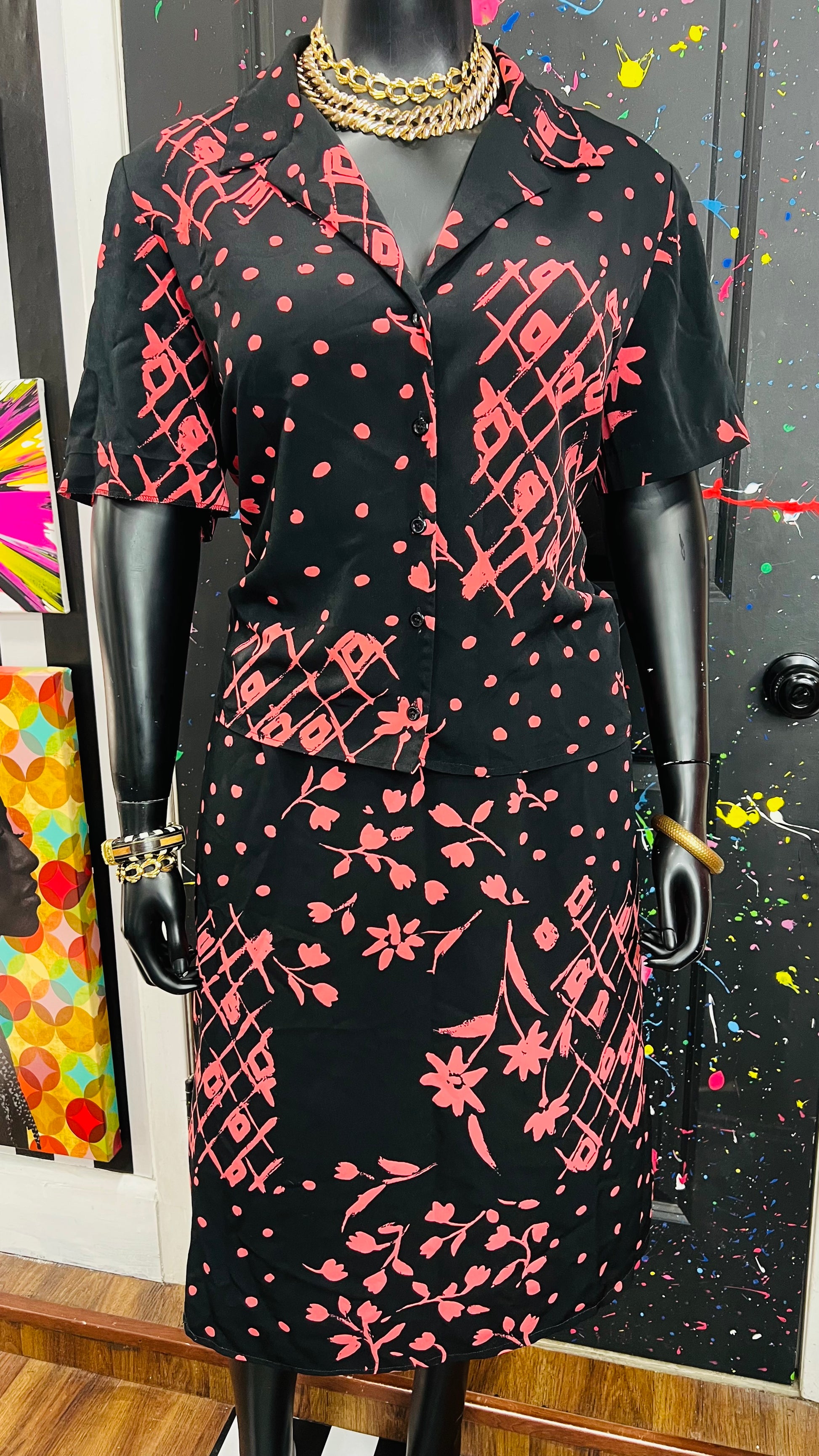 Vintage Pink, Black Polka Dot & Floral Skirt Set (18W)