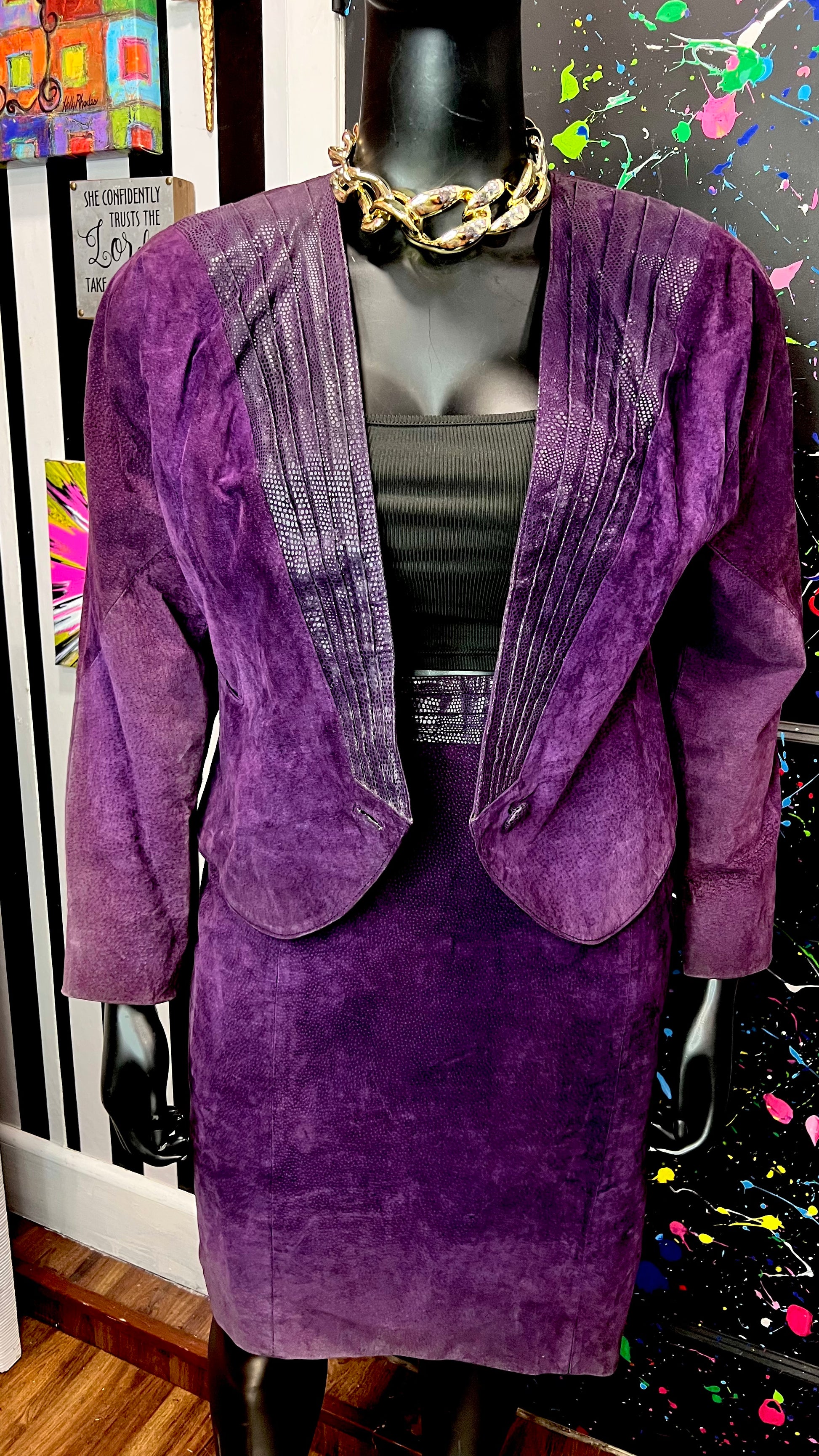 Vintage Purple Genuine Suede Leather Skirt Suit (14/16)