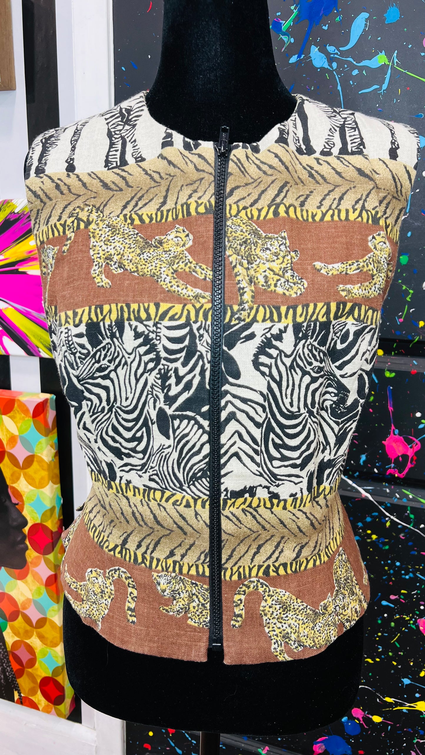 The Safari print is complete throughout the vest. The back of the vest also has the same print.
