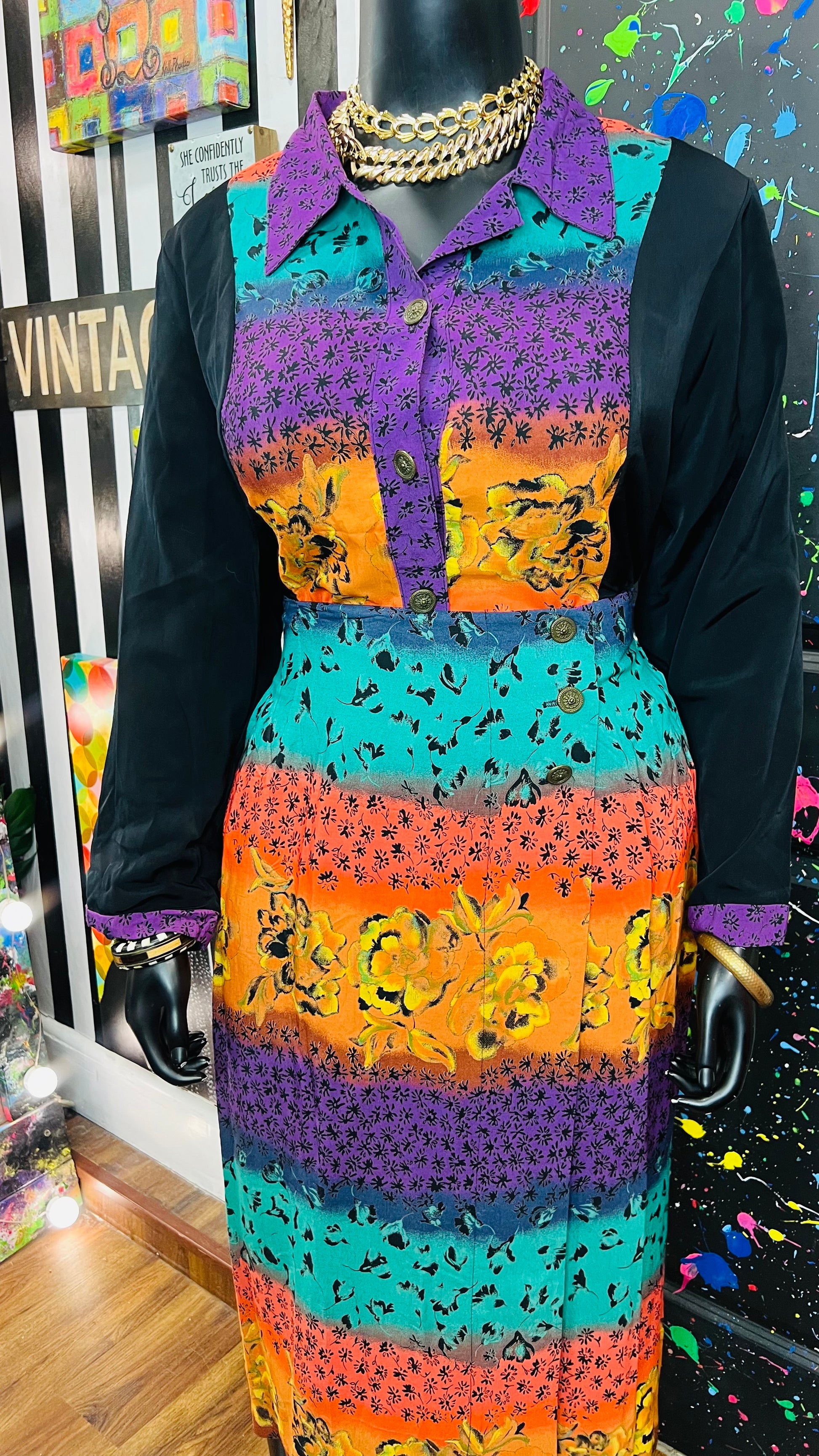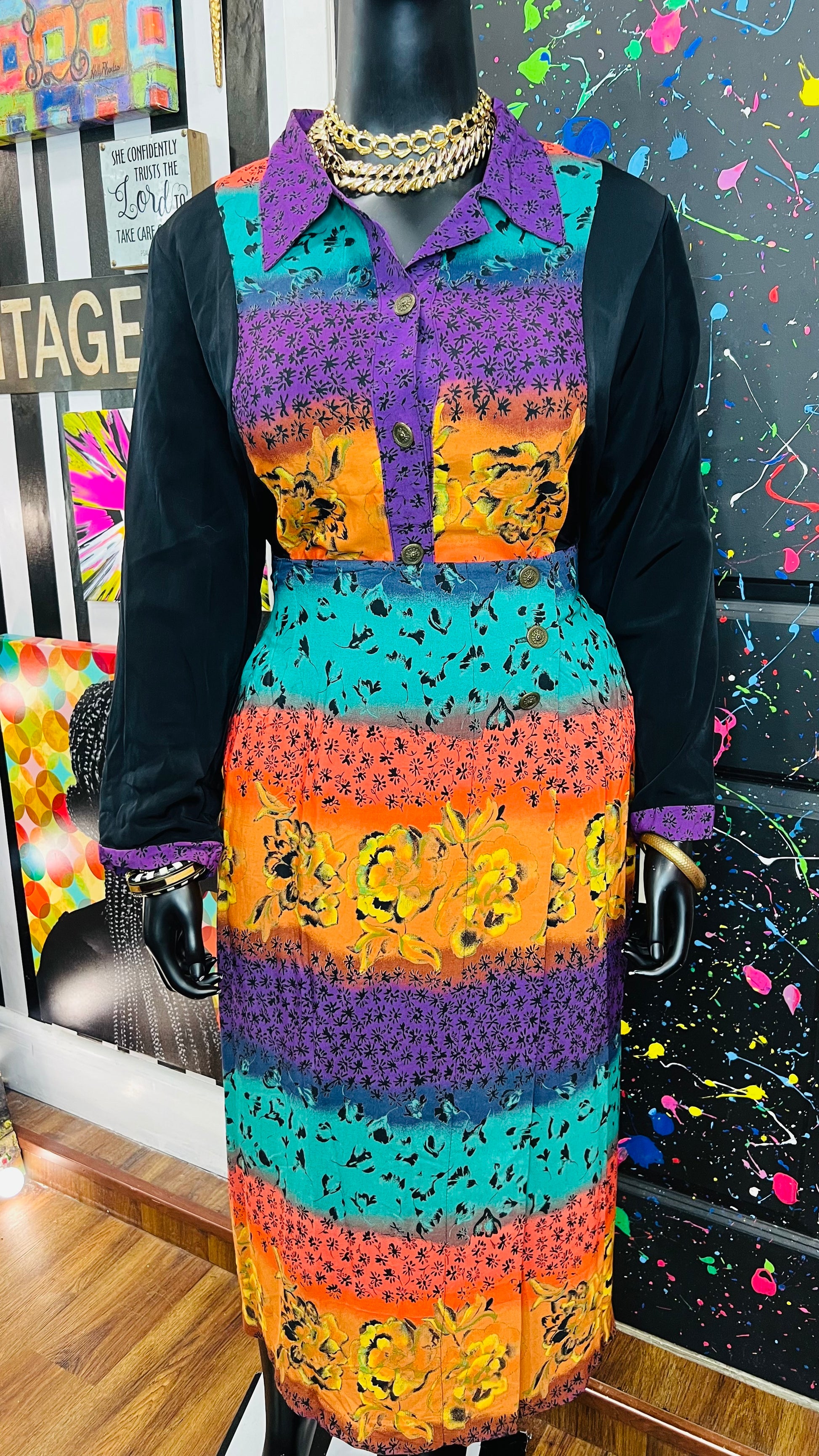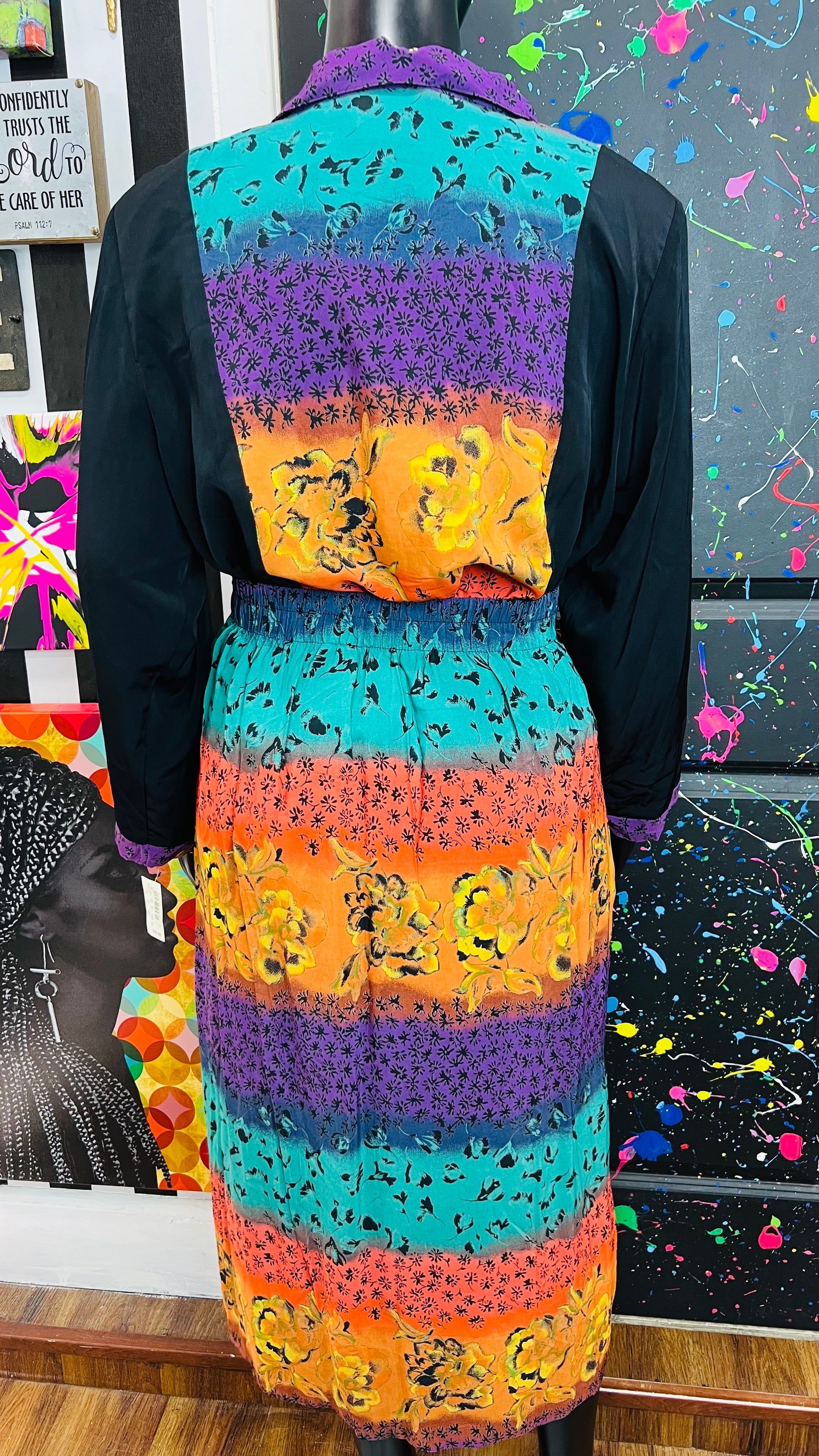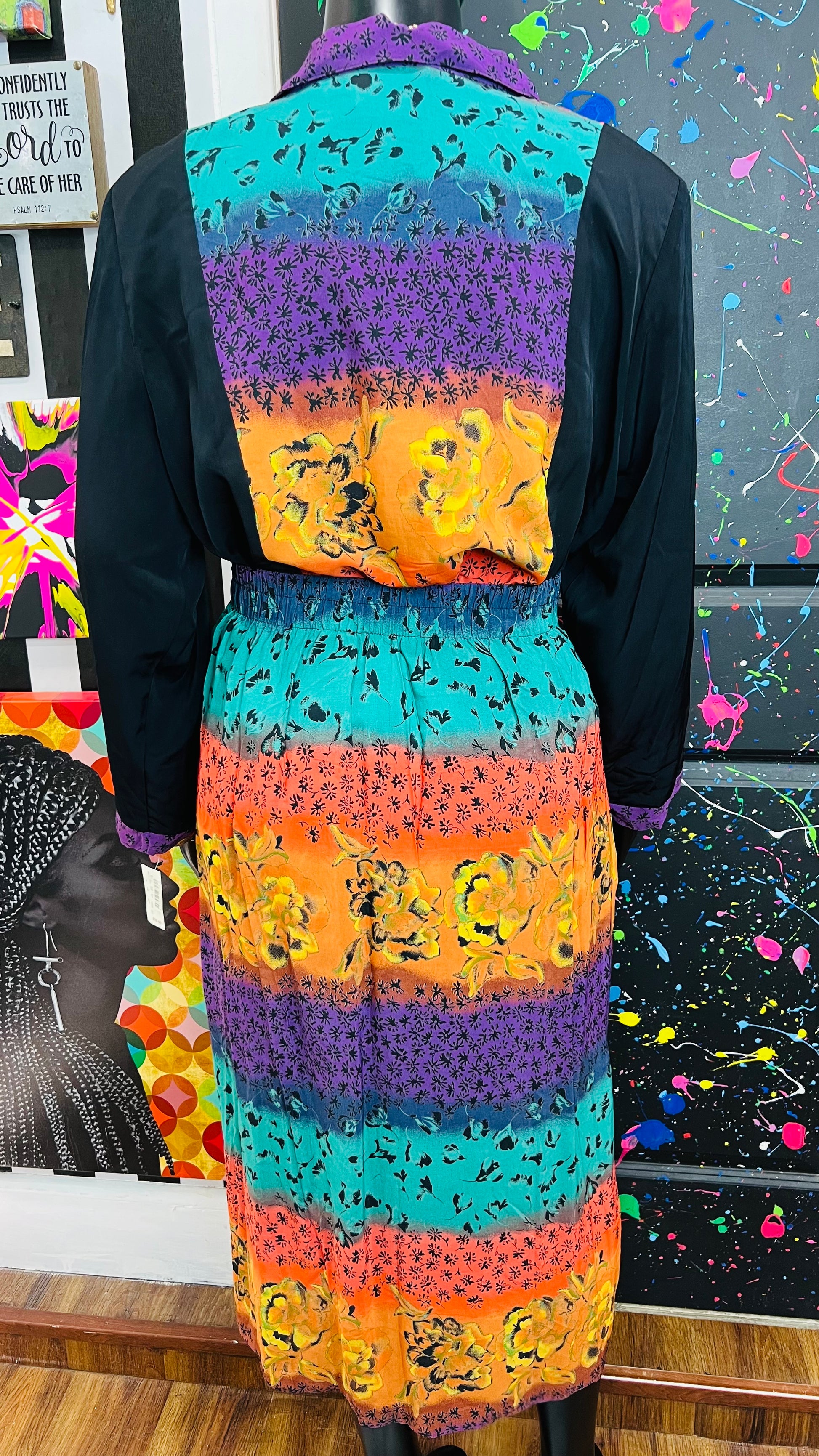 This vintage Sharon Anthony skirt set is complete with the original tags and has never been worn or used. The skirt is tagged as a size 16, but based on its measurements, it is comparable to the size 22 blouse in the set. See below for exact measurements of the skirt.