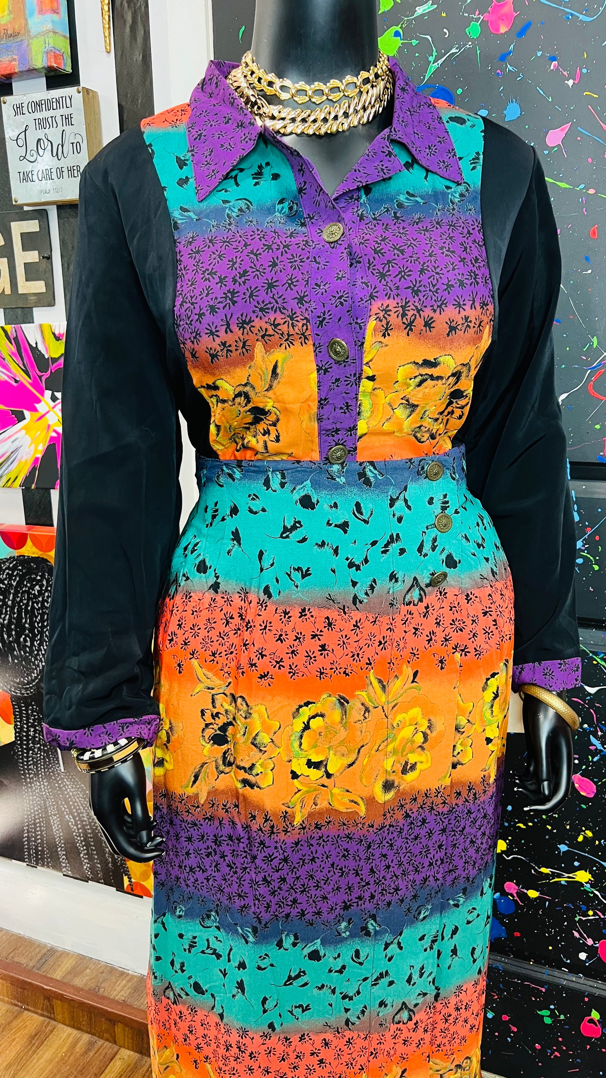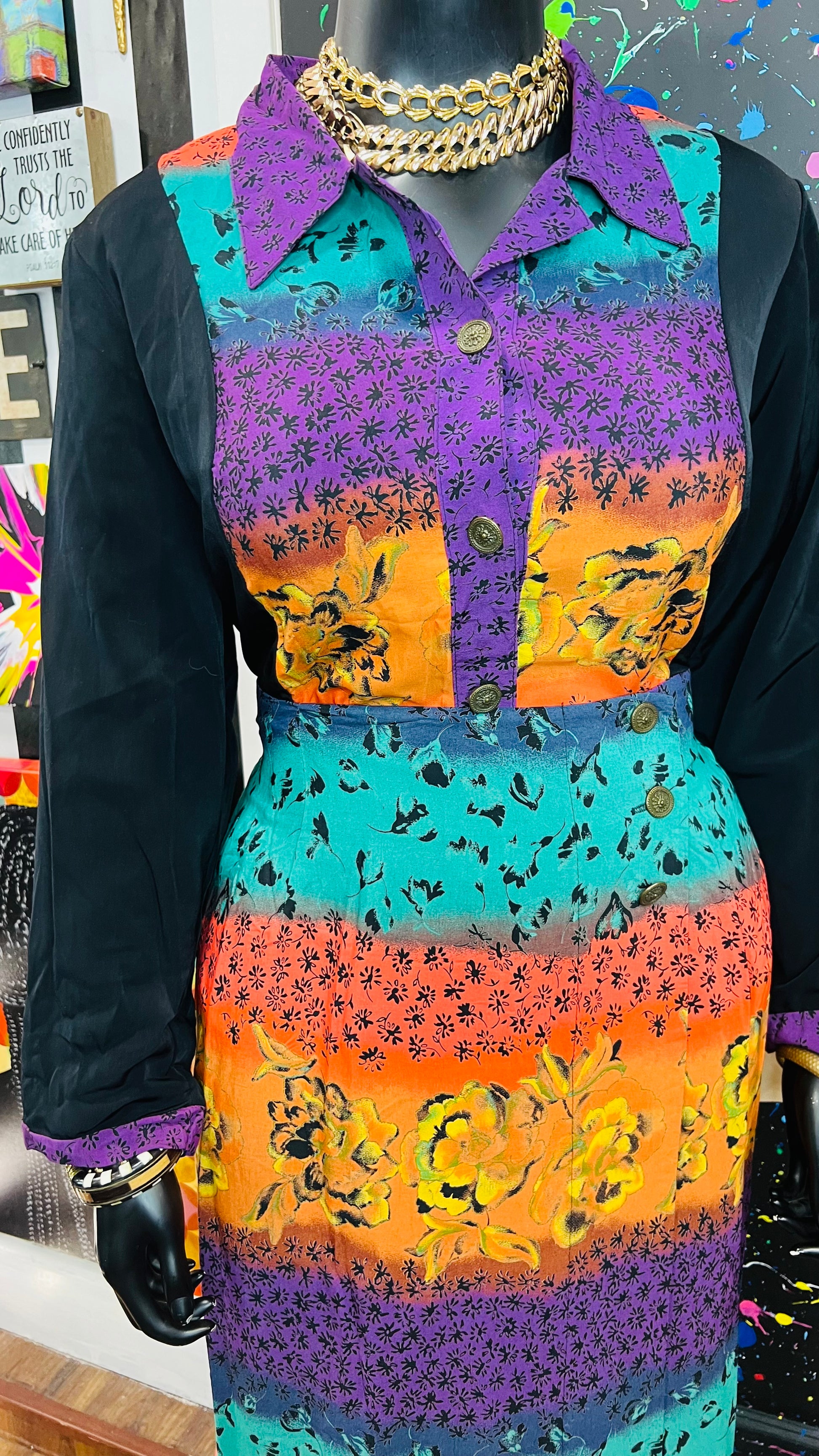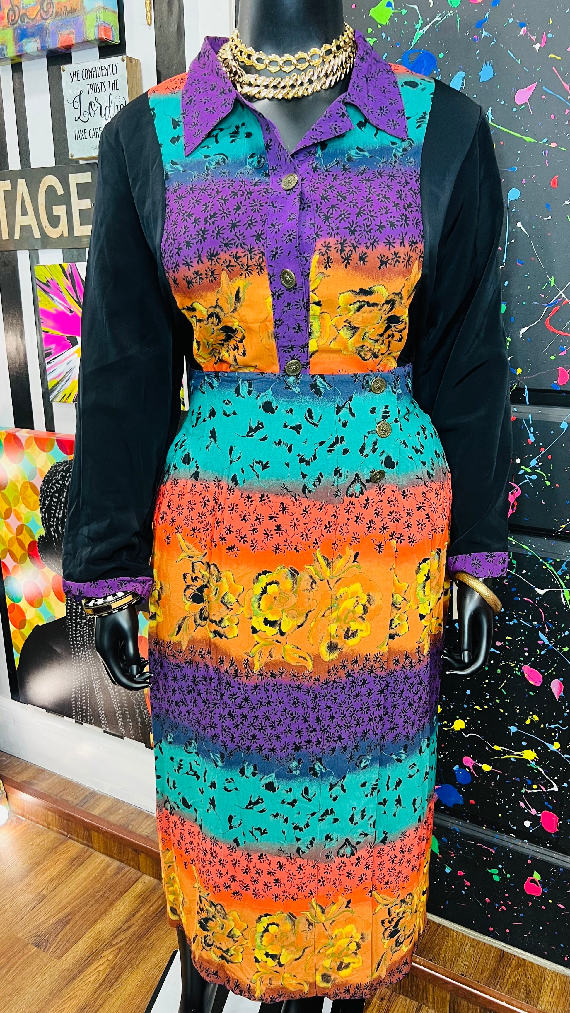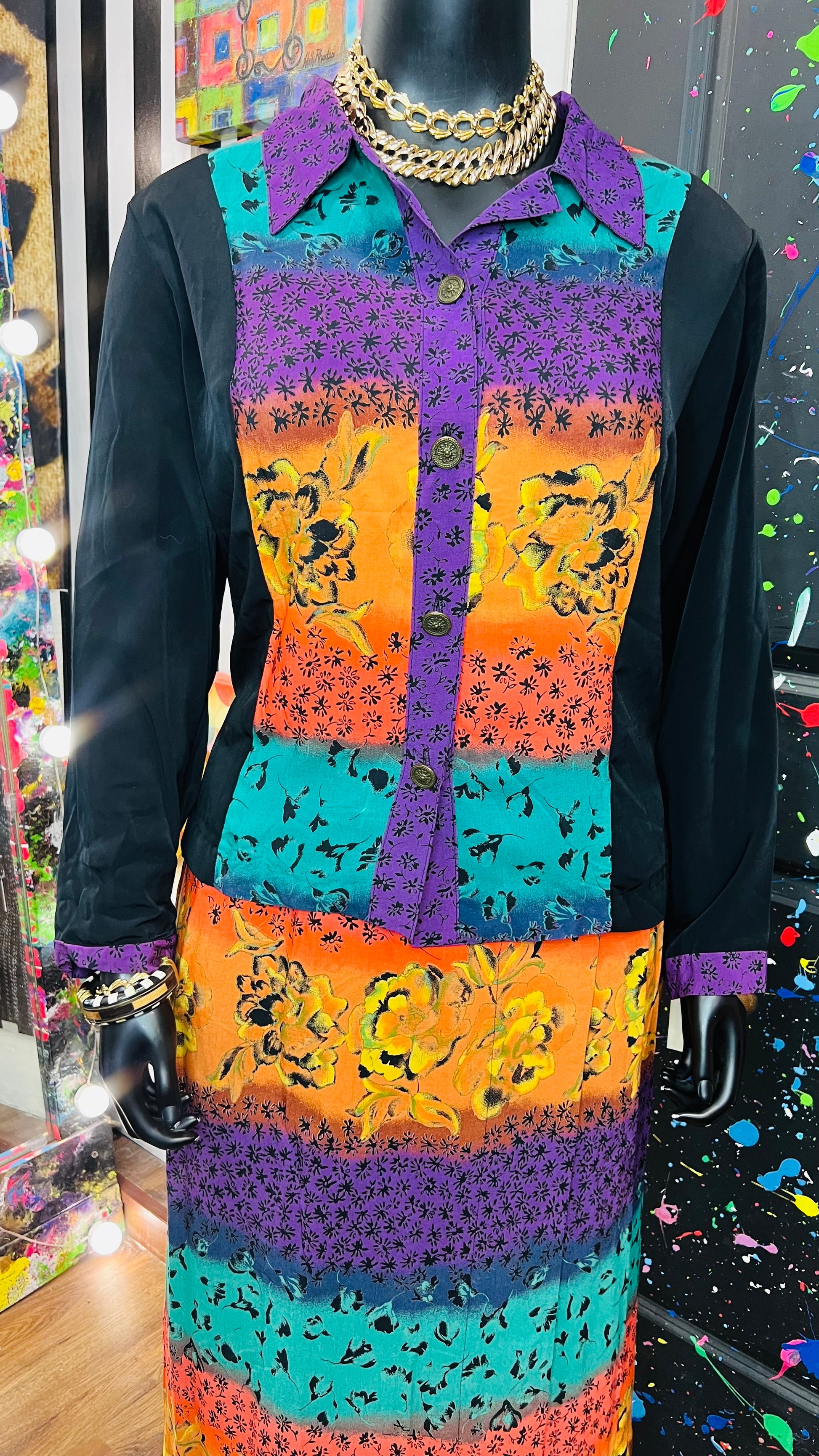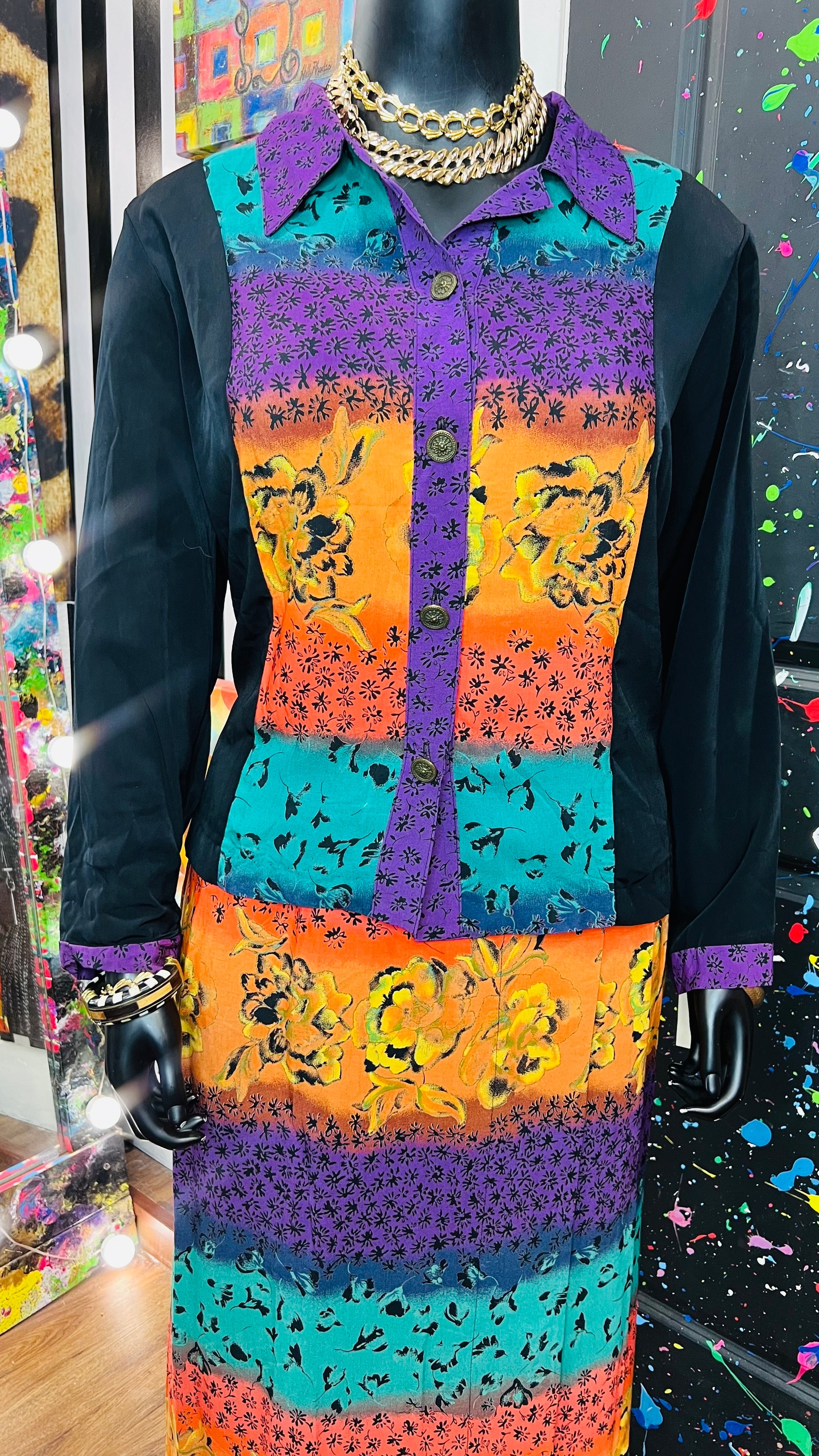 This vintage Sharon Anthony skirt set is complete with the original tags and has never been worn or used. The skirt is tagged as a size 16, but based on its measurements, it is comparable to the size 22 blouse in the set. See below for exact measurements of the skirt.