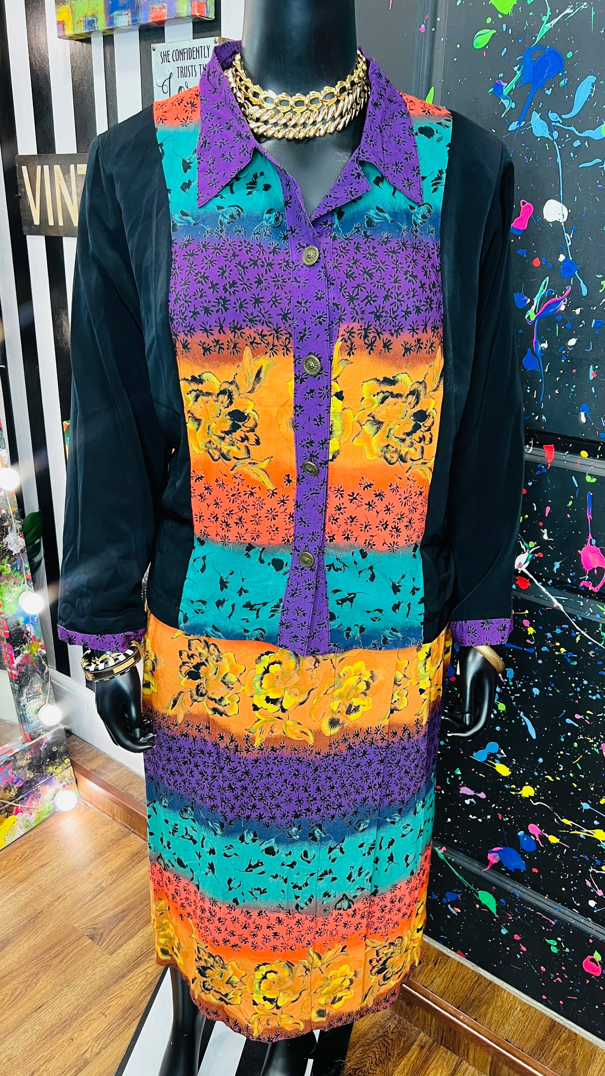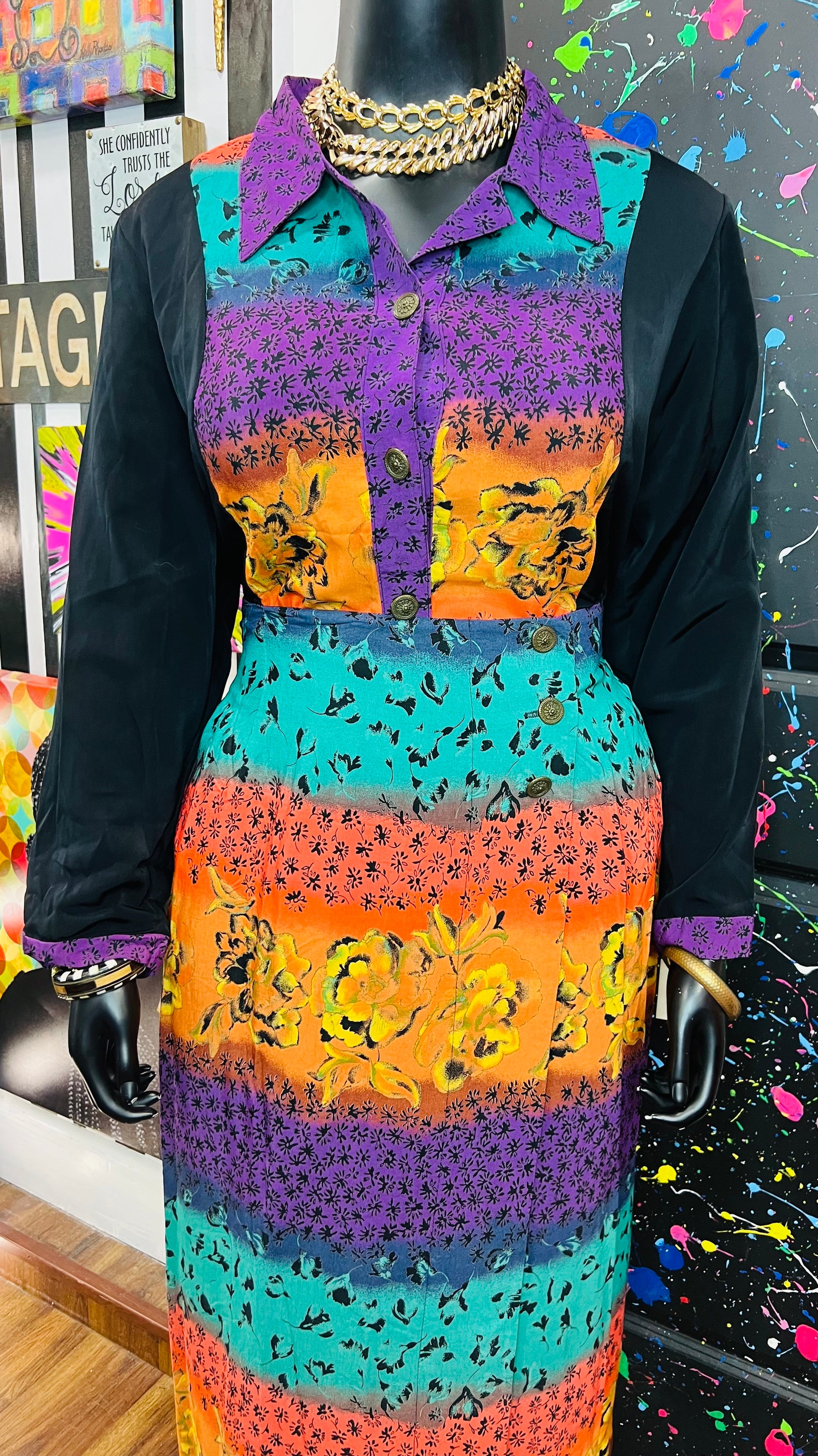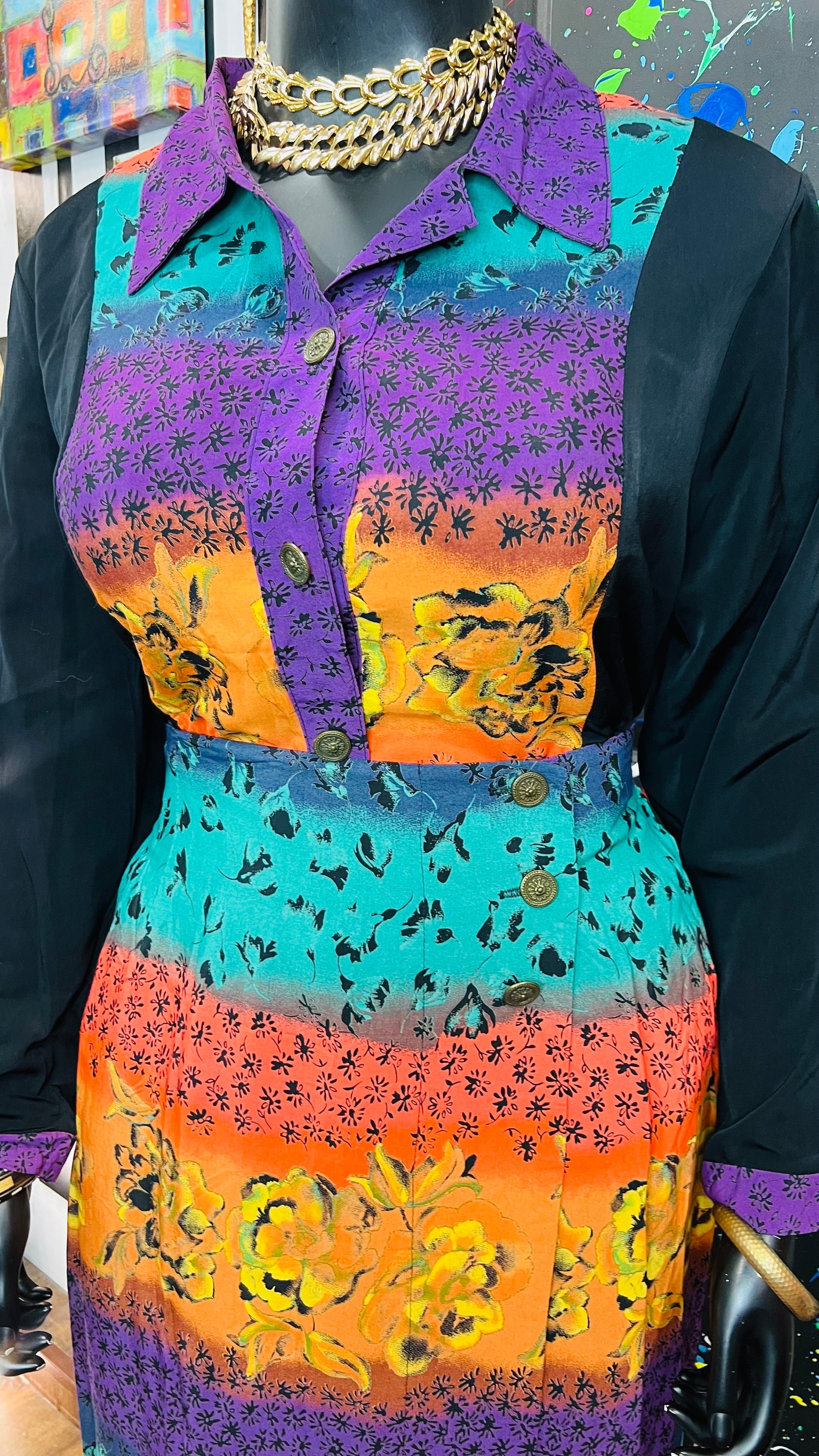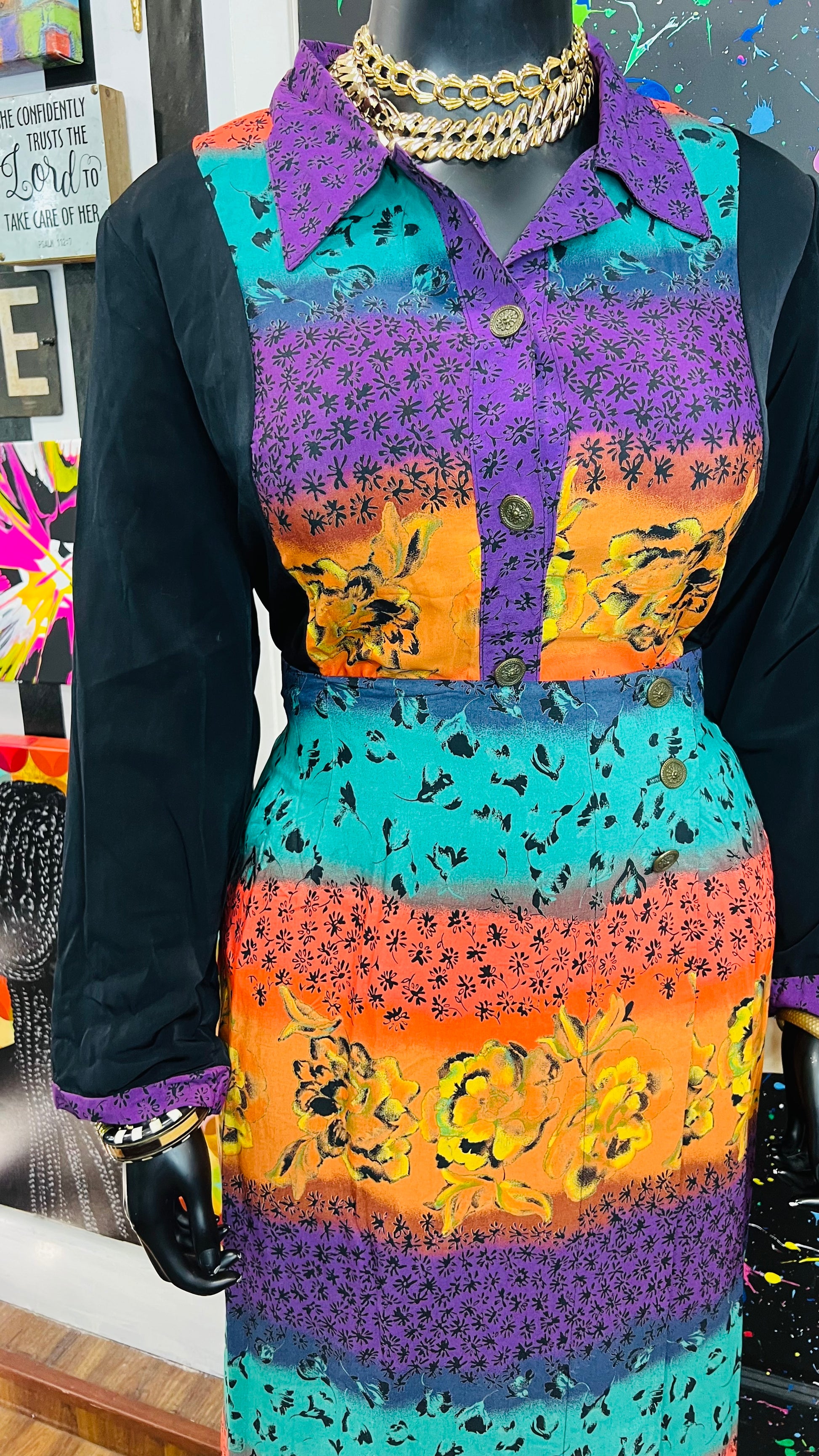 This vintage Sharon Anthony skirt set is complete with the original tags and has never been worn or used. The skirt is tagged as a size 16, but based on its measurements, it is comparable to the size 22 blouse in the set. See below for exact measurements of the skirt.