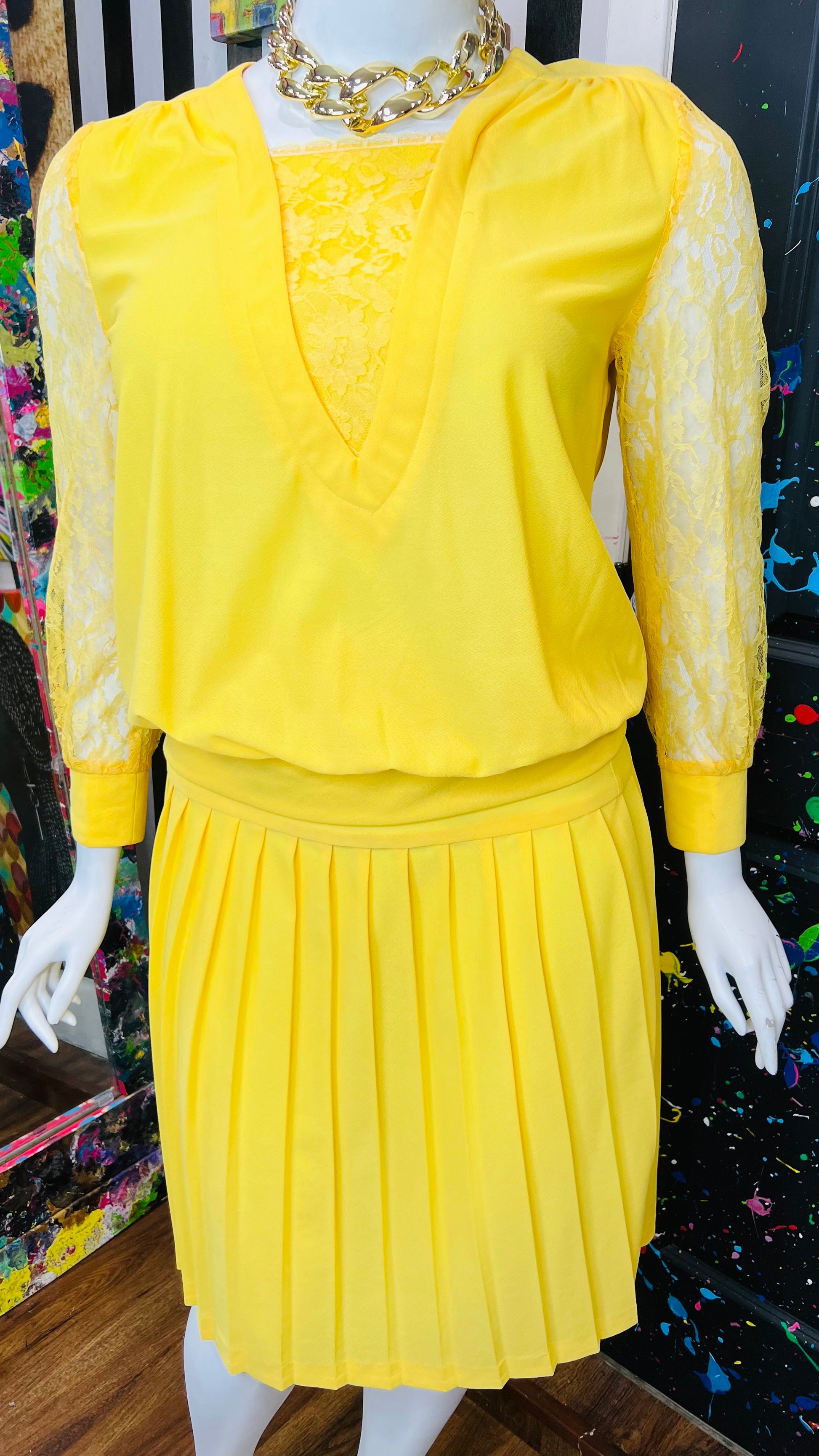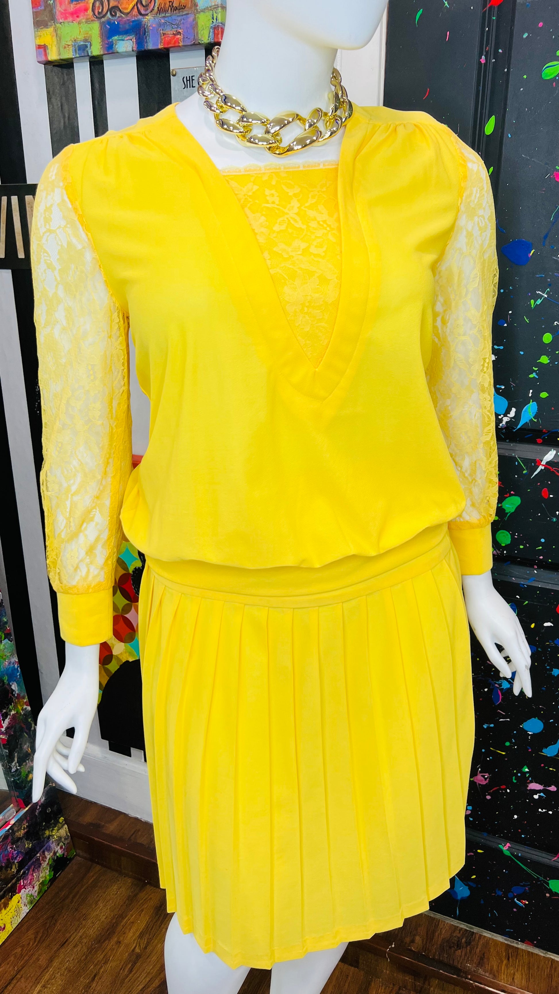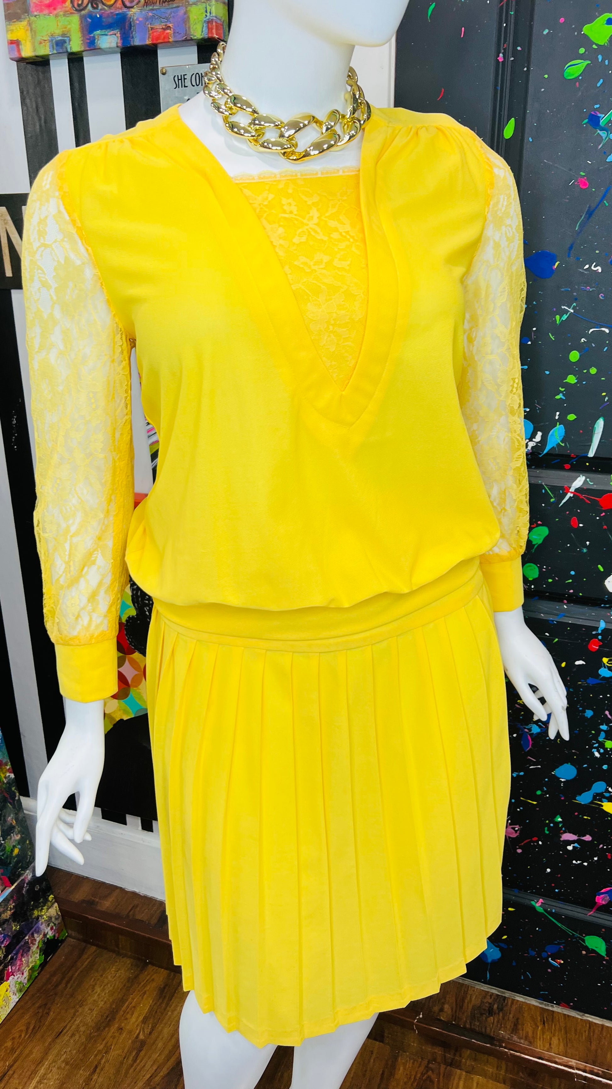 Vintage Yellow Pleated Skirt w/ Lace Skirt Set (16)