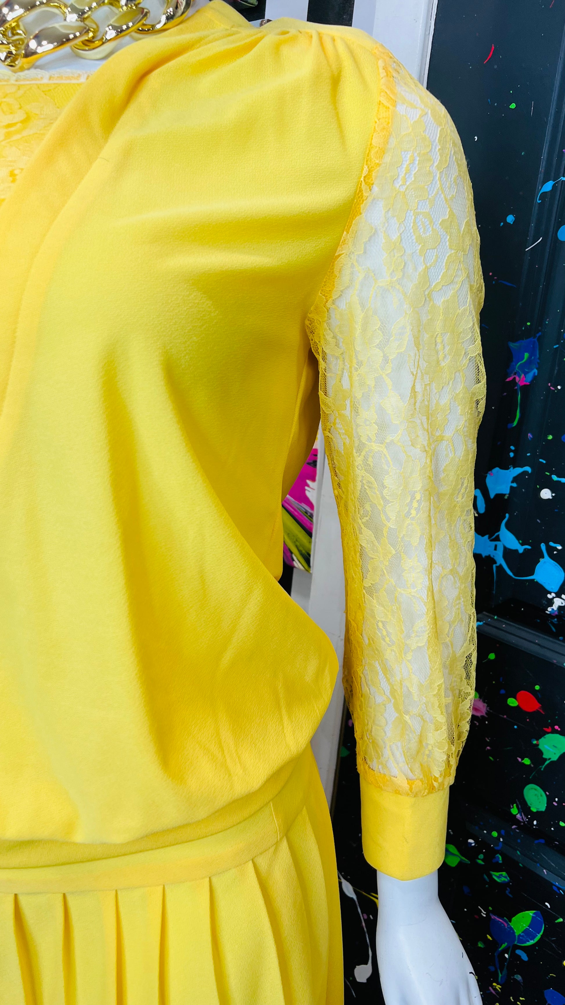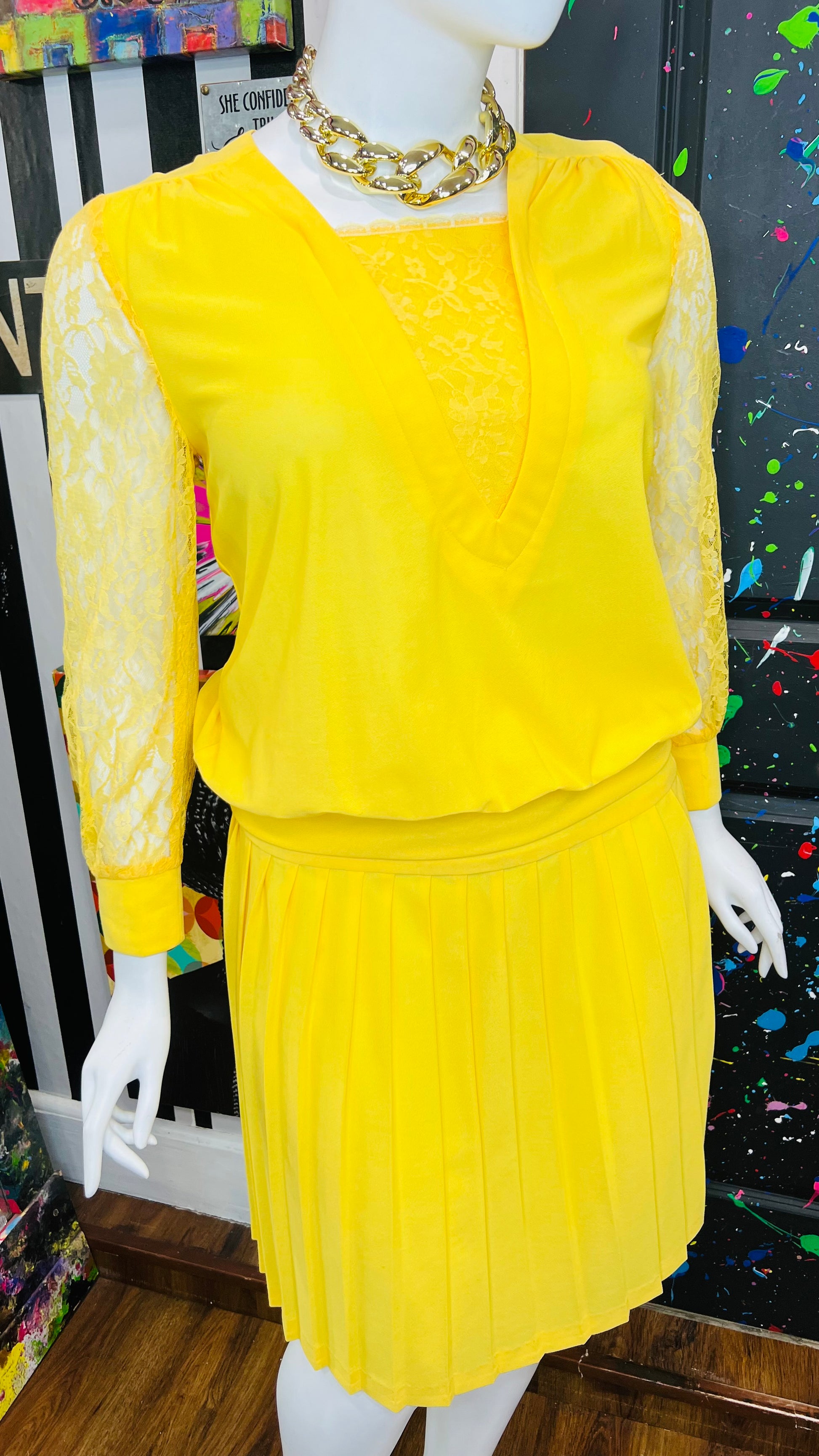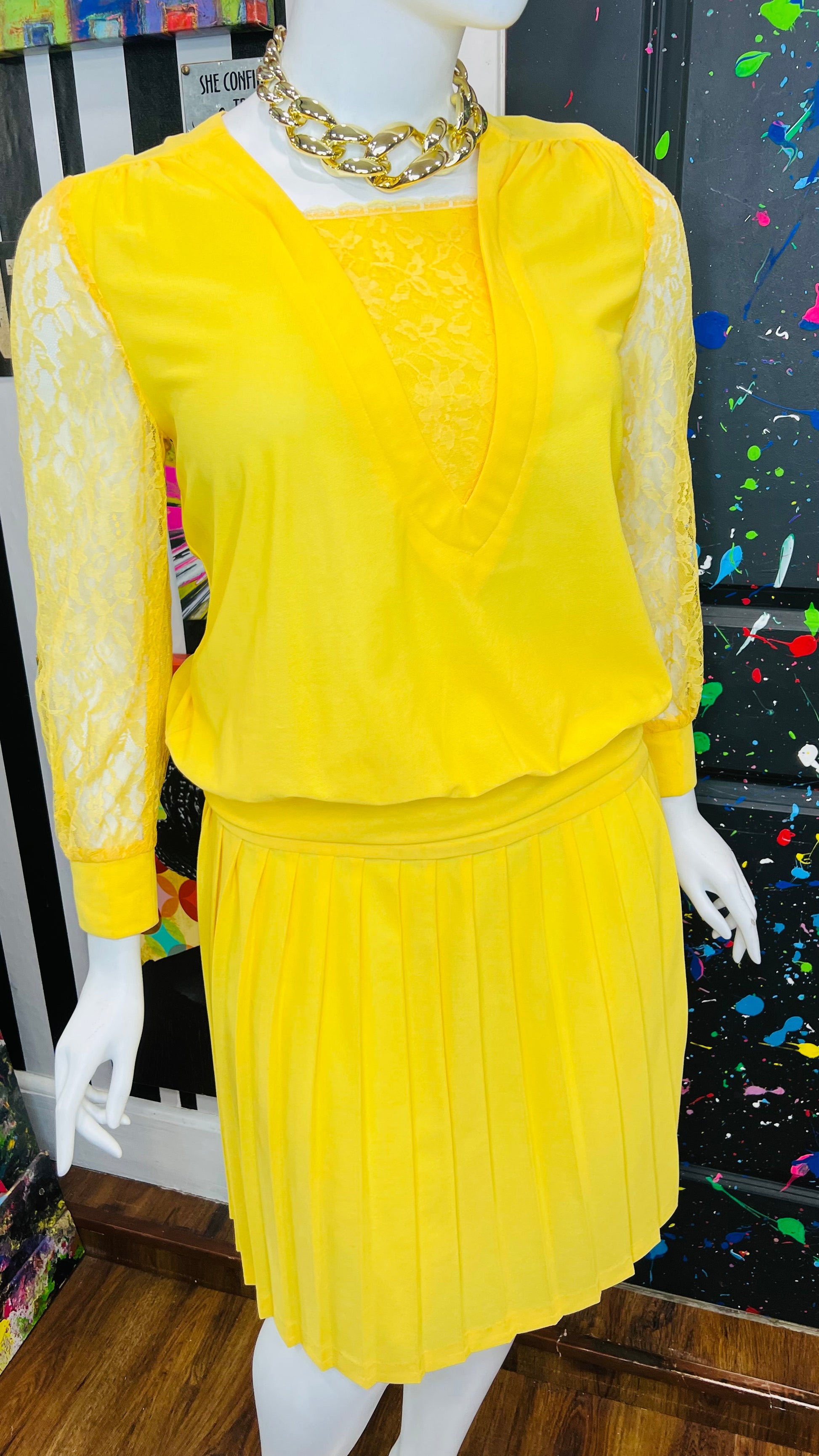 Vintage Yellow Pleated Skirt w/ Lace Skirt Set (16)